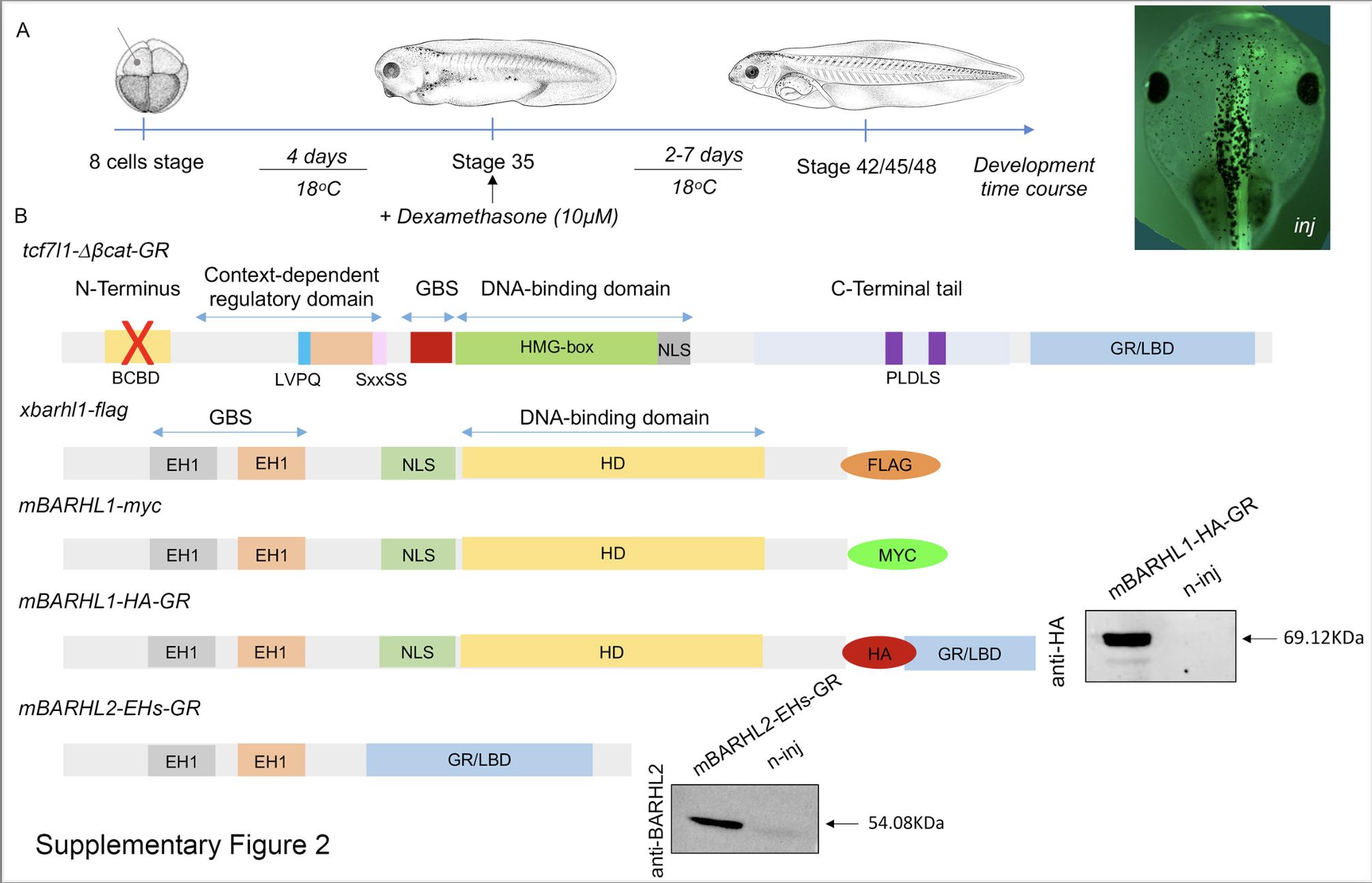 Figure S2. Experimental procedure and constructs (A) Representation of the injection procedure. mRNAs of the different constructs used in this study (B) were co-injected with a tracer - gfp mRNA in X. laevis and mcherry mRNA in X. tropicalis - into one dorsal blastomere at the four/eight-cell stage embryo. Unilaterally injected embryos were selected. On the right is the image of a stage 48 X. laevis embryo injected with gfp as tracer. Injected and wild-type embryos were left to develop at 18C. For embryos injected with inducible constructs, half of the injected embryos were treated with 10M dexamethasone at stage 35, while the other half were untreated and used as control. Embryos were fixed at different stages and used for further analysis by ISH. (B) Schematic representation of the different constructs used in this study. Construct organization is indicated in the drawings. Tcf7l1delta betacat-GR lacks the Beta-catenin-binding domain (BCBD) at its N-terminal region (yellow). Absence of this domain reinforces its repressive activity. It contains the DNA- binding domain which contains a High-Mobility Group box (HMG-box) (green) and a Nuclear Localization Signal (NLS) (grey). The DNA-binding domain is preceded by a less well-defined binding sequence for the Groucho/Transducin-like enhancer of split (Gro/TLE) (Gro-binding sequence, GBS) (red). The Context-dependent Regulatory Domain (CRD) is encoded by three exons and is flanked by two small motifs LVPQ shown in blue at its N-terminal end, and SxxSS shown in pink at its C terminal end. The long (E) tail of Tcf7l1 (light blue) contains two C- terminal-binding protein (CtBP) motifs (PLDLS) (purple). This construct is inducible and contains at its Carboxyl (C) terminal end a glucocorticoid receptor/ligand binding domain (GR/LBD). xBarhl1 and mBarhl1 are composed of the full length Barhl1 structure including both N-terminal Engrailed Homology motifs (EH1) (grey and orange), the NLS (light green) followed by the homeodomain (HD) (yellow). xBarhl1 is Flag-tagged. mBarhl1 is Myc tagged. mBarhl1-HA-GR is HA tagged and is inducible. Inducible mBarhl2EHs-GR contains the two EH domains and acts as dominant negative. Western blot was carried out on extract from embryos injected with the mBarhl1-HA-GR and mBarhl2EHs-GR constructs and their expression validated. Samples were separated by SDS-page and detected by immunoblotting with anti-Ha, anti-Flag, anti-Myc, or anti-Barhl2. On the right are shown the molecular weights in kDa. n-inj: non-injected. |