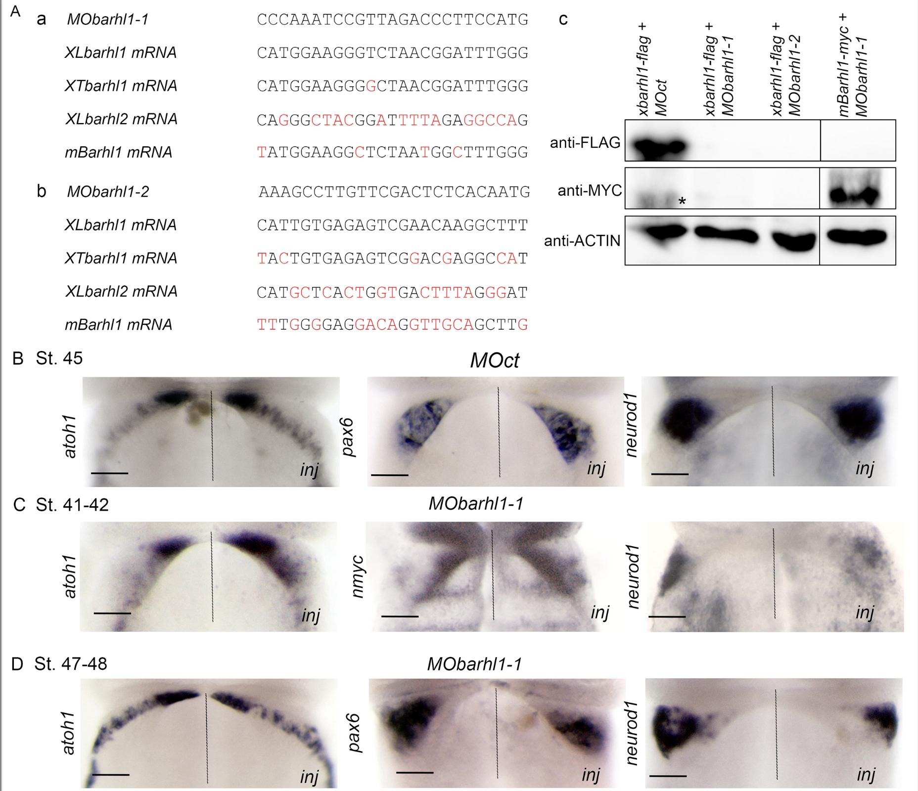 Figure S3. Morpholino-mediated depletion of xBarhl1 and its impact on GNPs development (Aa-c) MObarhl1-1 and MObarhl1-2 specifically block translation of xbarhl1 mRNA. (a, b) Morpholino (MO) oligonucleotides were designed to target the translation initiation site of X. laevis and X. tropicalis (XL/XT) barhl1 mRNA. MObarhl1-1 and MObarhl1-2 do not hybridize with mouse Barhl1 and X. laevis barhl2 mRNAs. X. tropicalis were injected with MObarhl1-1. Red characters indicate nucleotides that do not hybridized with MObarhl1-1 and MObarhl1-2. (c) Western blot on extracts from X. laevis embryos injected with flag-tagged xbarhl1 (xbarhl1- flag) together with MObarhl1-1, or MObarhl1-2, or control MO (MOct). myc-tagged mBarhl1 (mBarhl1-myc) was co-injected with MObarhl1-1. MObarhl1-1 and MObarhl1-2 induced a dramatic decrease in xBarhl1 protein levels without affecting those of mBarhl1-myc, while MOct had no effect on xBarhl1 expression. Membranes were incubated with stripping buffer to eliminate primary anti-flag and secondary antibodies. Asterisk indicates post-stripping xBarhl1- flag corresponding band. Actin was used as loading control to confirm that levels of proteins loaded are equal across the gel. (B) Injection of MOct didnt induce any significant effect. in situ hybridization analysis of atoh1, pax6 and neurod1 expressions in stage 45 X. laevis embryos injected with MOct (20ng). (C-D) Analysis of MObarhl1-1 effect at stage 41 and stage 48. ISH analysis of X. laevis embryos injected with MObarhl1-1 (15ng) report a significant increase in atoh1 expression and a dramatic decrease in the commitment/differentiation markers pax6 and neurod1 at stage 41 and stage 48. Scale bar 150m. |