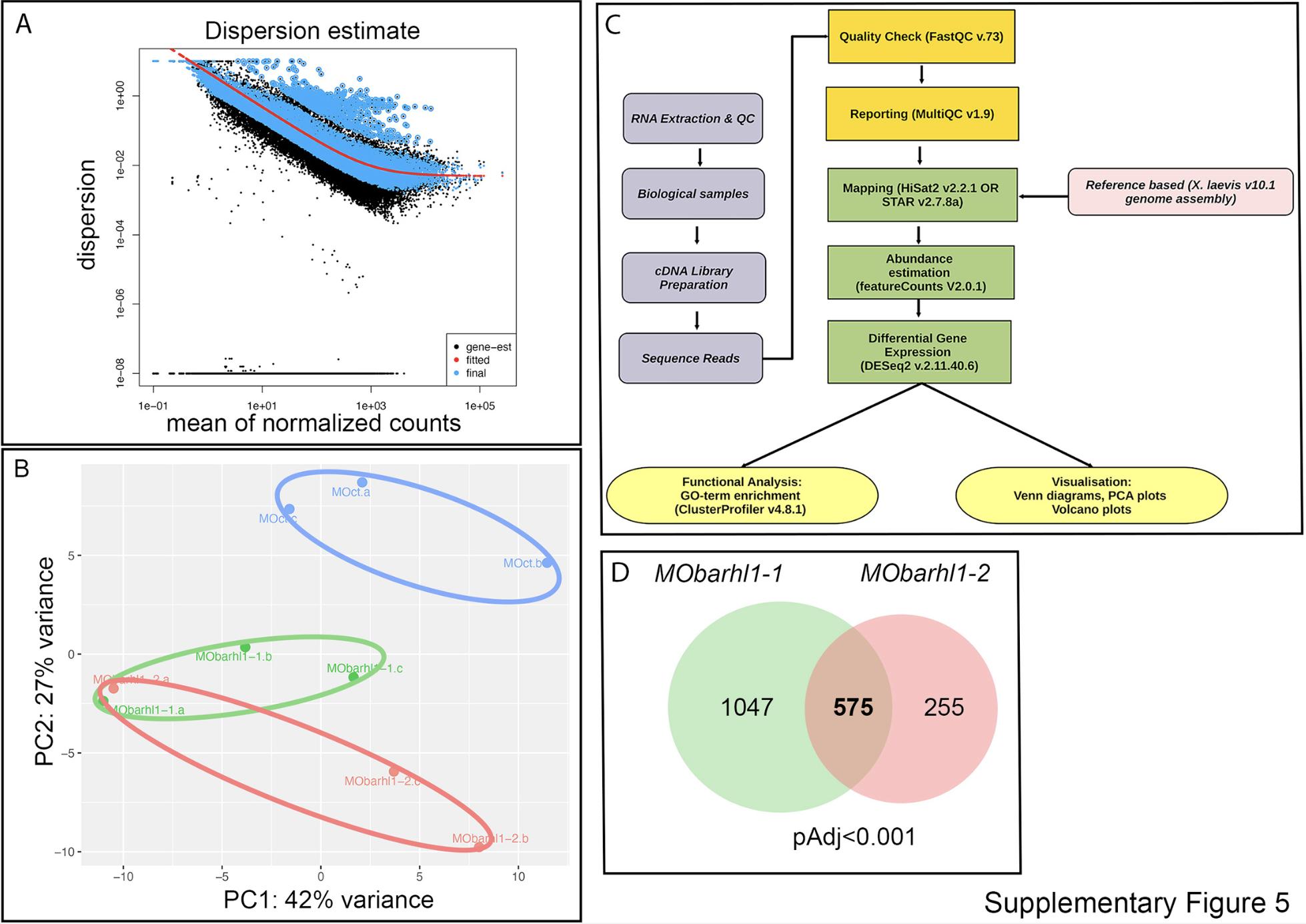 Figure S5. Analysis of count data from RNAseq and Work Flow. (A) Dispersion plot showing the dispersion estimates for each gene separately (black points), and the dispersions’ dependence on the mean of normalized counts (red line). Final estimates are represented by blue points. The blue circles are genes which have high gene-wise dispersion estimates. (B) Principal Component Analysis (PCA) plots were obtained based on RNAseq data aligned with STAR and reads counted using feature-counts. Three samples have been generated for each condition. Sample groups are represented by different colors as indicated. Each dot refers to a sample. Samples showing similar gene expression profiles are clustered together. (C) Scheme of the RNA-seq work flow (see Star Methods for details) (D) Venn-Diagram showing the distribution of DEGs between MObarhl1-1 vs MOct and MObarhl1- 2 vs MOct. The numbers of DEGs with pAdj<0.001 exclusively expressed by each subset and genes overlapping between both conditions are indicated. Green represents MObarhl1-1 vs MOct and light red represents MObarhl1-2 vs MOct. Venn diagram is generated using Galaxy. |