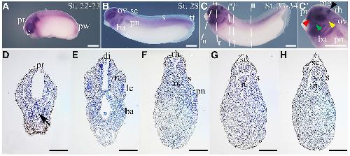 Embryo developmental stages (St.) are indicated at the top right corner of each panel. (A,B,C) Lateral views of whole-mount hybridized embryos, anterior to the left; (C') magnified view of (C). Dashed lines in (C) indicate the section planes shown in (D-H). (D-H) Transverse sections from whole-mount St. 33-34 embryos, dorsal to the top. Black arrow in (D) points to the Rathke’s pouch. Black arrowhead in (C') indicates the midbrain-hindbrain boundary; yellow arrowhead indicates lateral line placode; green arrowhead indicates epibranchial placode, and red arrowhead indicates olfactory placode. Scale bars: 500 µm in (A-C, C’); 250 µm in (D-H). ba, branchial arches; di, diencephalon; e, eye; le, lens; me, mesencephalon; n, notochord; ov, otic vesicle; pn, pronephros; pr, prosencephalon; pw, posterior wall; re, retina; rh, rhombencephalon; s, somites; sc, spinal cord; tt, tail tip.