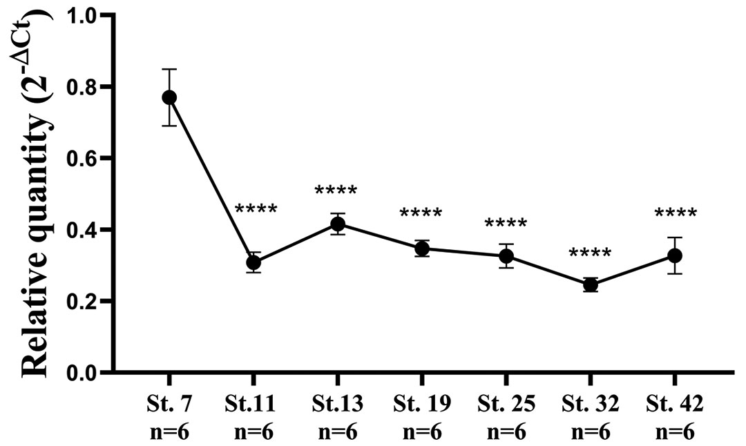 cDNAs were synthesized from embryos and larvae at different developmental stages (St., indicated at the bottom of the panel) and amplified using specific primers for thg1l, as well as sub1.S, slc35b1.L and ppp1ca.L, used for normalization. As technical control, reverse transcriptase was omitted. Asterisks (*) indicate statistically significant difference between each stage and St. 7. Data are expressed as mean ± standard error of the mean; n, number of samples analysed. ANOVA followed by Tukey post-hoc test: ****p < 0.0001.
