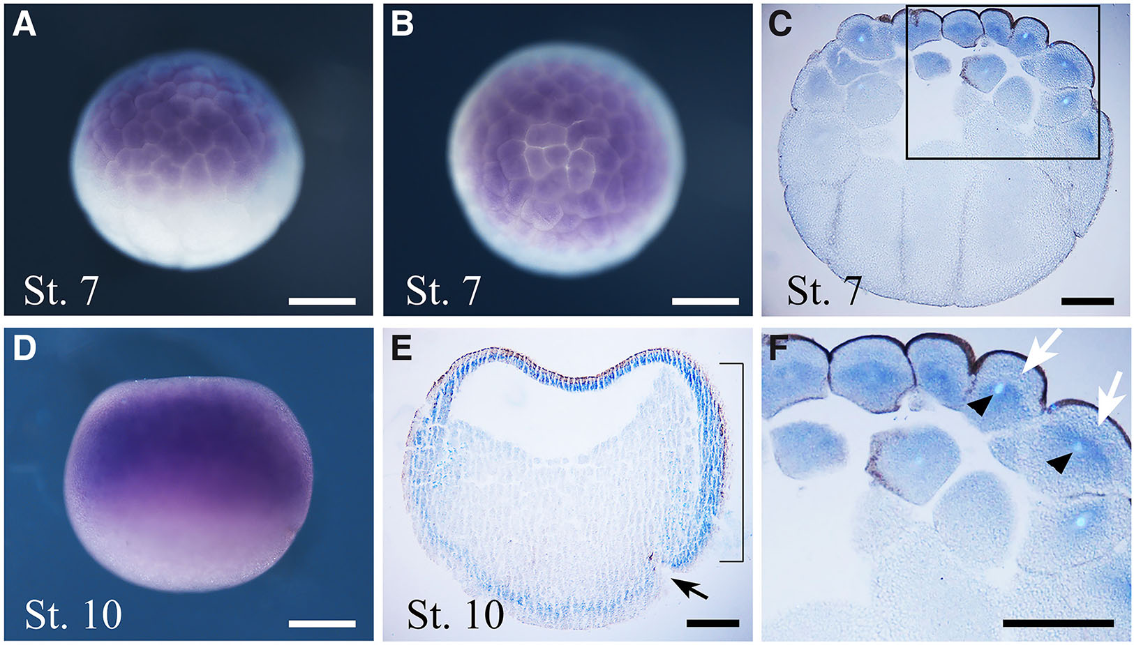 Embryo developmental stages (St.) are indicated at the bottom left corner of each panel. (A,D) Lateral view, animal pole to the top and vegetal pole to the bottom, and (B) animal view, of whole-mount stained embryos. (C,E) Sagittal sections from whole-mount embryos, animal pole to the top and vegetal pole to the bottom. Black arrow in (E) points to the dorsal lip of the blastopore. (F) Magnified view of the boxed region indicated in (C), showing the intracellular localization of thg1l transcripts in animal blastomeres. White arrows show absence of the transcript in the apical portion of cytoplasm, whereas black arrowheads indicate Hoechst-stained nuclei. Bracket in (E) indicate the dorsal involuting mesoderm. Scale bars: 200 µm in (A,B,D); 150 µm in (C,E,F).