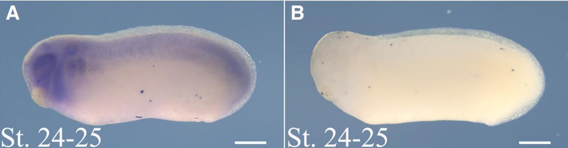 Embryo developmental stages (St.) are indicated at the bottom left corner of each panel. (A,C,E) Frontal view, dorsal to the top, and (B,D,F) dorsal view, frontal to the top, of whole-mount hybridized embryos. Black arrows indicate the anterior neural plate. Yellow arrows point to the neural crests. Red arrows indicate the neural tube. Black arrowheads point to the optic vesicles. Yellow arrowheads indicate migrating neural crest cells. Scale bar: 250 µm.