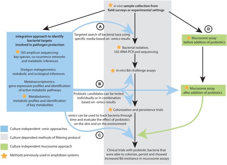 Emerging infectious diseases in wildlife are responsible for massive population declines. In amphibians, chytridiomycosis caused by Batrachochytrium dendrobatidis, Bd, has severely affected many amphibian populations and species around the world. One promising management strategy is probiotic bioaugmentation of antifungal bacteria on amphibian skin. In vivo experimental trials using bioaugmentation strategies have had mixed results, and therefore a more informed strategy is needed to select successful probiotic candidates. Metagenomic, transcriptomic, and metabolomic methods, colloquially called "omics," are approaches that can better inform probiotic selection and optimize selection protocols. The integration of multiple omic data using bioinformatic and statistical tools and in silico models that link bacterial community structure with bacterial defensive function can allow the identification of species involved in pathogen inhibition. We recommend using 16S rRNA gene amplicon sequencing and methods such as indicator species analysis, the Kolmogorov-Smirnov Measure, and co-occurrence networks to identify bacteria that are associated with pathogen resistance in field surveys and experimental trials. In addition to 16S amplicon sequencing, we recommend approaches that give insight into symbiont function such as shotgun metagenomics, metatranscriptomics, or metabolomics to maximize the probability of finding effective probiotic candidates, which can then be isolated in culture and tested in persistence and clinical trials. An effective mitigation strategy to ameliorate chytridiomycosis and other emerging infectious diseases is necessary; the advancement of omic methods and the integration of multiple omic data provide a promising avenue toward conservation of imperiled species.