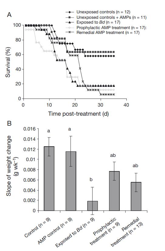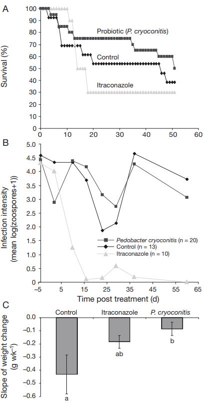 (Bd) with the antifungal itraconazole or the probiotic bacterium Pedobacter cryoconitis. (A) Kaplan-Meier survival