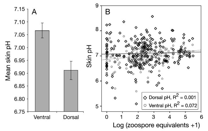 dendrobatidis (Bd). (A) Mean (±SE) pH of ventral and dorsal skin surfaces.