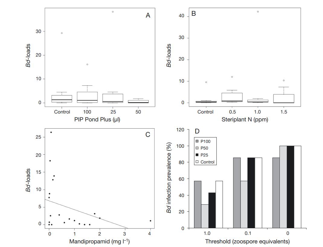 and 95% quantiles (whiskers), and outliers (s). (C) No significant effect of the mandipropamid treatment on the Bd load (linear