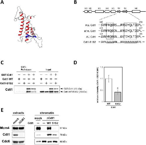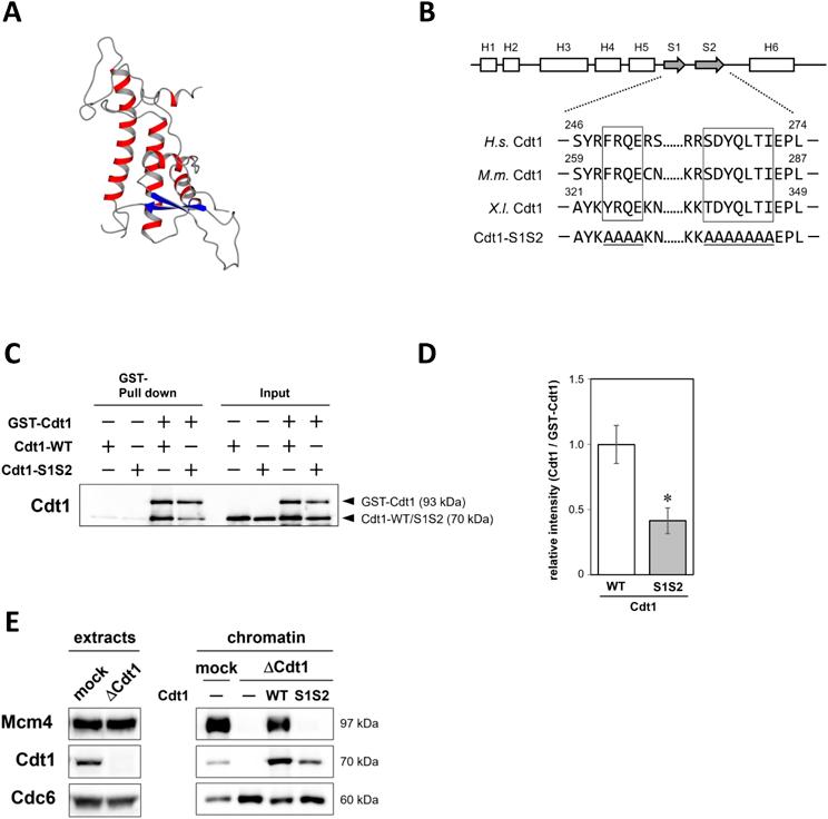 (A) Crystral structure of the central region of mouse Cdt1 (PDB ID: 2ZXX) in ribbon representation. Alpha-helices and β-strands are colored red and blue, respectively. (B) Secondary structure of the central winged-helix domain of Cdt1 (upper) and sequence alignment of the two β-strands from human (H.s.), mouse (M.m.), and Xenopus (X.l.) Cdt1 proteins (middle). Amino acid residues mutated in Cdt1-S1S2 are framed by a box in the alignment. The amino acid sequence of the two β-strands of Cdt1-S1S2 are also indicated (lower). (C) GST-Cdt1, untagged wild-type Cdt1 (Cdt1-WT), or untagged Cdt1-S1S2 were mixed as indicated before GST pull-down fractions were immunoblotted to detect Cdt1. (D) Quantification of the Cdt1-WT and Cdt1-S1S2 band intensity from the Western blot shown in panel (C). The plotted intensity of the bands is relative to that of GST-Cdt1. The graph depicts the results from three independent experiments. Error bars represent standard error. * p < 0.05, Student’s two-tailed t-test. (E) Cdt1- and mock-depleted Xenopus egg extracts were electrophoresed and immunoblotted to detect Mcm4, Cdt1, and Cdc6 (left panel). The Cdt1-depleted extracts were supplemented with 10 nM untagged Cdt1-WT or Cdt1-S1S2 and incubated with sperm nuclei for 20 min. After the incubation, the chromatin fraction was isolated and immunoblotted to detect Mcm4, Cdt1, and Cdc6 (right panel).