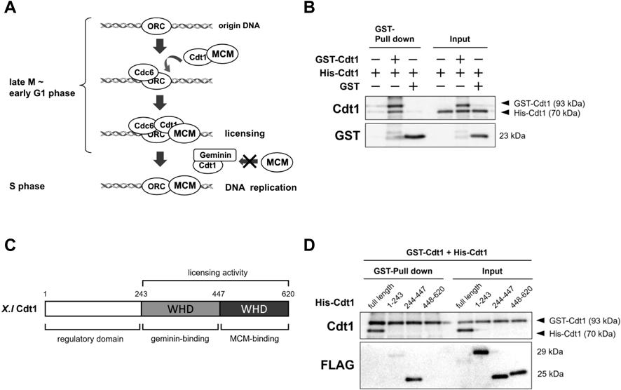 (A) Schematic representation of the licensing reaction. (B) GST-tagged Cdt1 (GST-Cdt1), His-tagged Cdt1 (His-Cdt1), and GST were added to the reaction mixture and incubated. GST pull-down fractions from the reaction mixtures were electrophoresed and immunoblotted to detect Cdt1 or GST. (C) Schematic representation of the protein structure of Xenopus laevis (X. l) Cdt1. “WHD” indicates the winged-helix domains of Cdt1. (D) GST-Cdt1, His-Cdt1, and His-FLAG-tagged Cdt1 fragments (1–243, 244–447, and 448–620) were added to the reaction mixture, followed by GST pull-down assay and immunoblot detection of Cdt1 and FLAG.