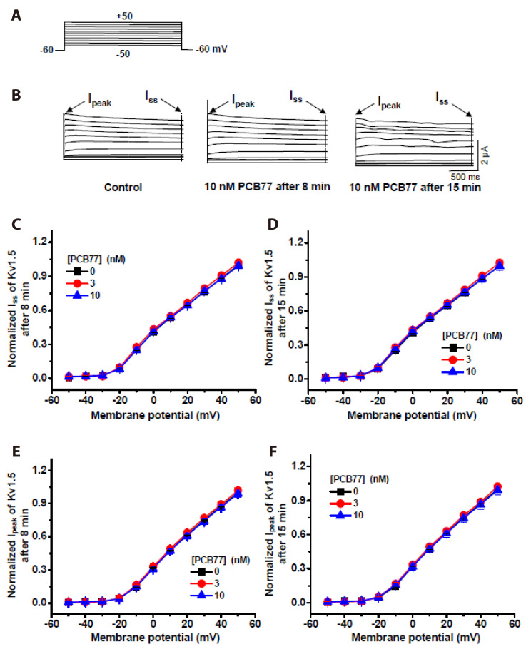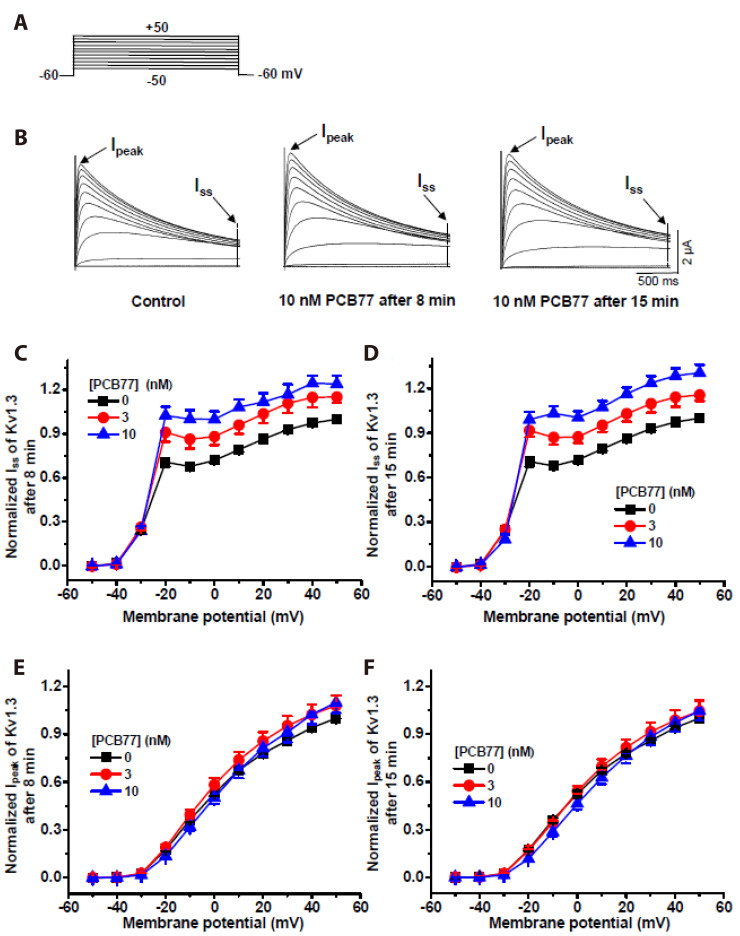 Fig. 2. 3,3′,4,4′-tetrachlorobiphenyl (PCB77) enhanced human steady-state Kv1.3 currents expressed in Xenopus oocytes.(A) Currents were evoked by 2-s voltage pulses from a holding potential of −60 to +50 mV with an increment of 10 mV. (B) The current traces from a control oocyte and one treated with 10 nM PCB77 for 8 and 15 min. (C−F) Steady-state current–voltage (C, D) and peak current–voltage (E, F) relationships for human Kv1.3 currents in the presence of 0 (control), 3, and 10 nM PCB77 for 8 min (C, E) or 15 min (D, F). Steady-state currents were measured at the end of the 2-s pulse shown as dotted lines. Peak currents and steady-state currents were normalized to the corresponding values at +50 mV. Data are presented as the mean ± SEM (n = 4–11 oocytes per concentration group).