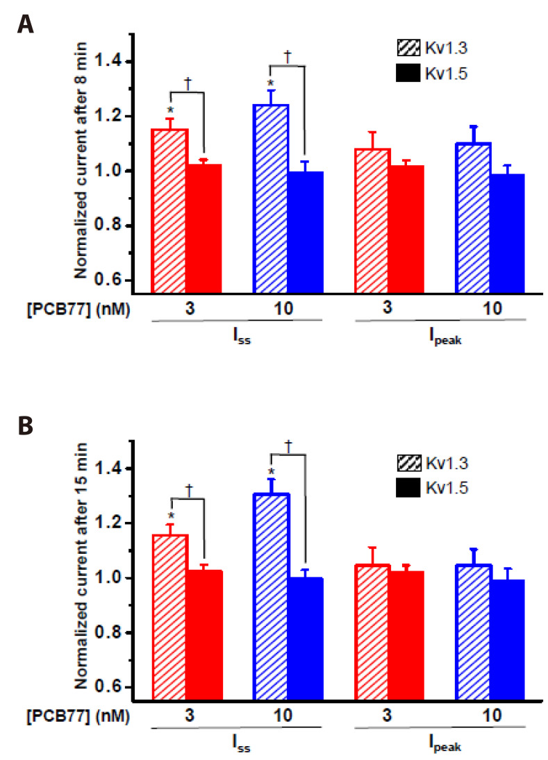 Fig. 4. Comparison of the effects of 3,3′,4,4′-tetrachlorobiphenyl (PCB77) on Kv1.3 and Kv1.5 currents.(A, B) Average changes in the magnitude of steady-state (Iss) and peak current (Ipeak) evoked at +50 mV by 3 and 10 nM PCB77 treatment for 8 (A) or 15 min (B) relative to the corresponding controls. Asterisks indicate significant differences between the control in the absence of PCB77 and the indicated currents in the presence of PCB77. Daggers indicate significant differences between Kv1.3 and Kv1.5 currents in the presence of PCB77. Data are presented as the mean ± SEM (n = 4–11 oocytes per concentration treatment, *, †p < 0.05).