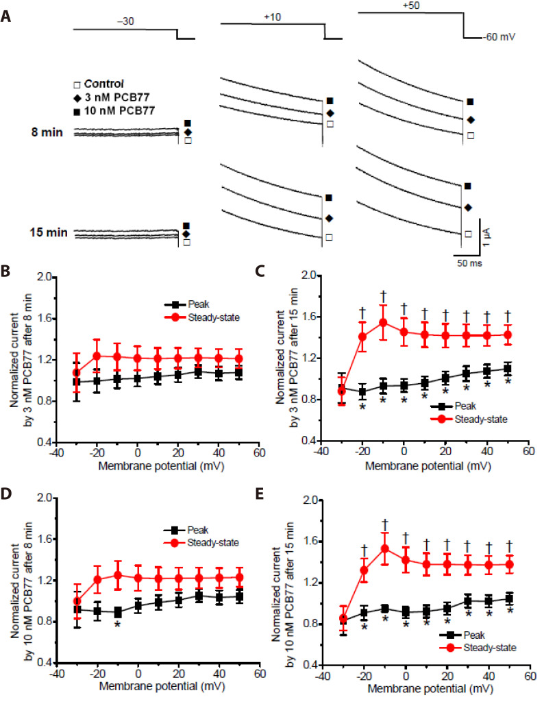 Fig. 5. Time and voltage-dependence of steady-state Kv1.3 current modulation by 3,3′,4,4′-tetrachlorobiphenyl (PCB77).(A) Current traces elicited by 2-s depolarizations of −20, +10, and +50 mV from a holding potential of −60 mV before (control) and after exposure to 3 and 10 nM PCB77. (B–E) PCB19-induced changes in peak and steady-state Kv1.3 currents at different command potentials. For each depolarizing voltage step, the current in the presence of 3 (B, C) or 10 nM PCB77 (D, E) at 8 and 15 min were normalized to the currents obtained in the absence of PCB77. Asterisks indicate significant differences between the peak and steady-state currents at each command potential in the presence of PCB77 vs. controls. Daggers indicate significant differences compared with the response at −30 mV. Data presented as mean ± SEM (n = 4–7 oocytes per concentration, *, †p < 0.05).