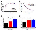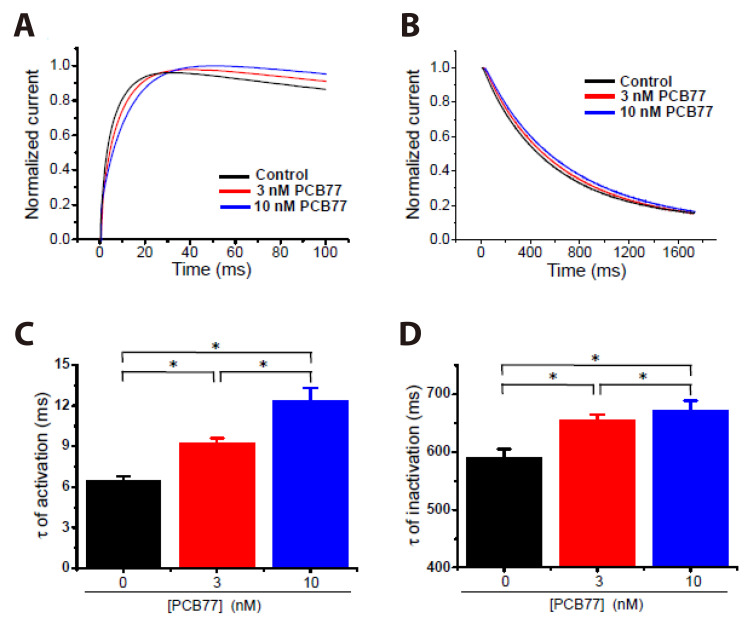 Fig. 6. Slowing of Kv1.3 current kinetics by 3,3′,4,4′-tetrachlorobiphenyl (PCB77).The time constants of current activation and inactivation were estimated by fitting each exponential function to traces evoked by a single +50 mV pulse for a 2-s duration from a holding potential of −60 mV. (A) Representative normalized current traces of the activation phase in the absence of PCB77 (dark) and the presence of 3 and 10 nM PCB77 for 15 min (colored). Each current trace was normalized to its peak value. (B) Representative normalized current traces for the inactivation phase in the absence of PCB77 and in the presence of 3 and 10 nM PCB77 for 15 min. (C, D) Summary of the activation time constants (C) and inactivation time constants (D). Data are presented as the mean ± SEM (n = 6–11 oocytes per concentration, *p < 0.05).