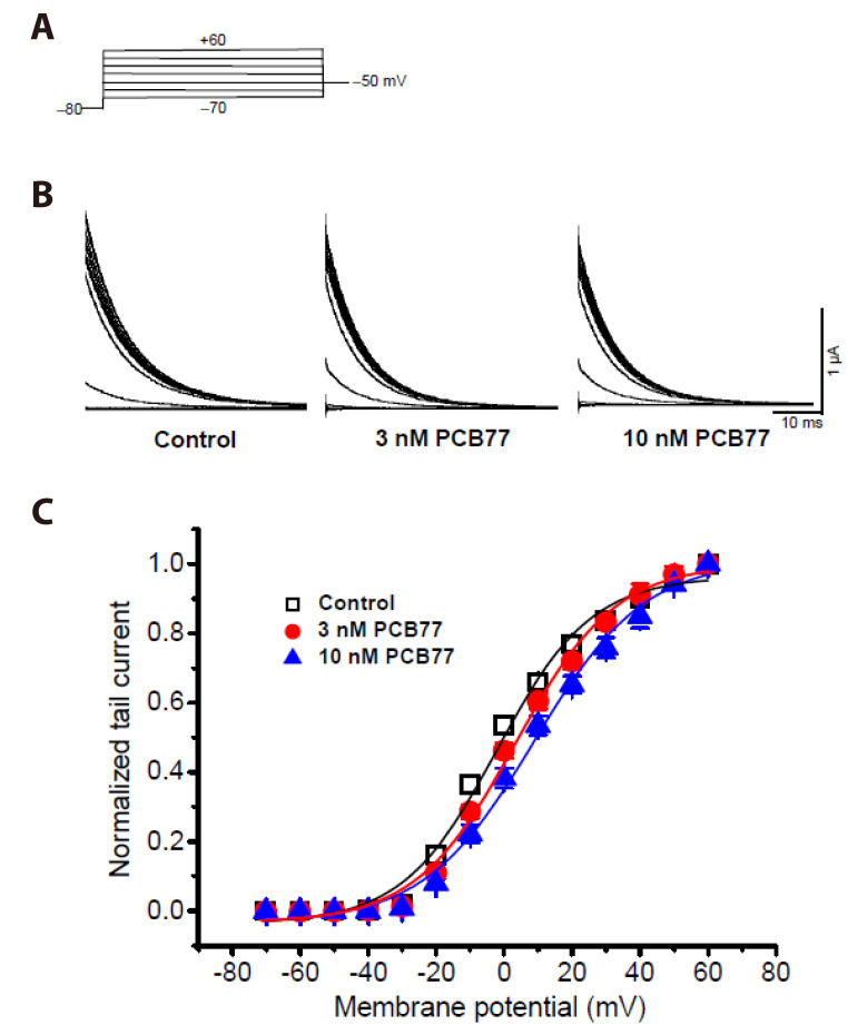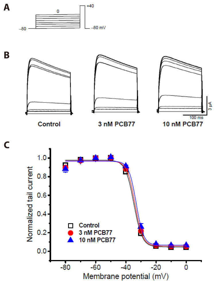 Fig. 8. 3,3′,4,4′-tetrachlorobiphenyl (PCB77) does not affect steady-state Kv1.3 current inactivation.(A) Typical tail currents elicited by depolarizing pulses from 30 s preconditioning potentials of −80–0 to +40 mV. (B) Superimposed steady-state inactivation currents in the presence of 0 (control), 3, and 10 nM PCB77. (C) Steady-state inactivation current amplitudes were normalized to those evoked from a preconditioning potential of −60 mV. The data were fitted to the Boltzmann equation to generate the steady-state inactivation curves for each condition. Data are presented as the mean ± SEM (n = 5 oocytes per concentration).