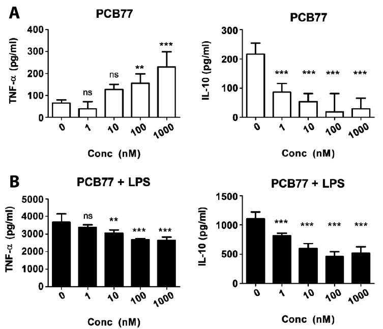 Fig. 10. 3,3′,4,4′-tetrachlorobiphenyl (PCB77) inhibits lipopolysaccharide-induced production of tumor necrosis factor-α (TNF-α) and interleukin-10 (IL-10) in mouse macrophages.(A) Raw264.7 cells were treated with PCB77 (10 μM) for 12 or 24 h. The release rates of TNF-α and IL-10 into the culture supernatant were measured using an enzyme-linked immunosorbent assay (ELISA). (B) Raw264.7 cells were pretreated with PCB77 for 24 h and then stimulated with lipopolysaccharide (LPS) for 12 or 24 h. The release rates of TNF-α and IL-10 into the culture supernatant were measured using an ELISA. All experiments were performed in triplicate and compared with a one-way analysis of variance followed by Tukey’s post-hoc test for multiple comparisons; **p < 0.01; ***p < 0.001, and not significant (ns) (p > 0.05).
