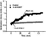 Fig. 9. Potentiating effects of 3,3′,4,4′-tetrachlorobiphenyl (PCB77) on Kv1.3 current are irreversible.Currents were evoked by a 200 ms depolarizing pulse to +60 mV from a holding potential of −60 mV at 10 s intervals before exposure to PCB77 (baseline), during the application of 10 nM PCB77, and washout. Steady-state currents were normalized to the baseline values. Normalized currents during PCB77 washout were compared with currents evoked in untreated oocytes after the same recording duration (n = 3 oocytes per treatment).