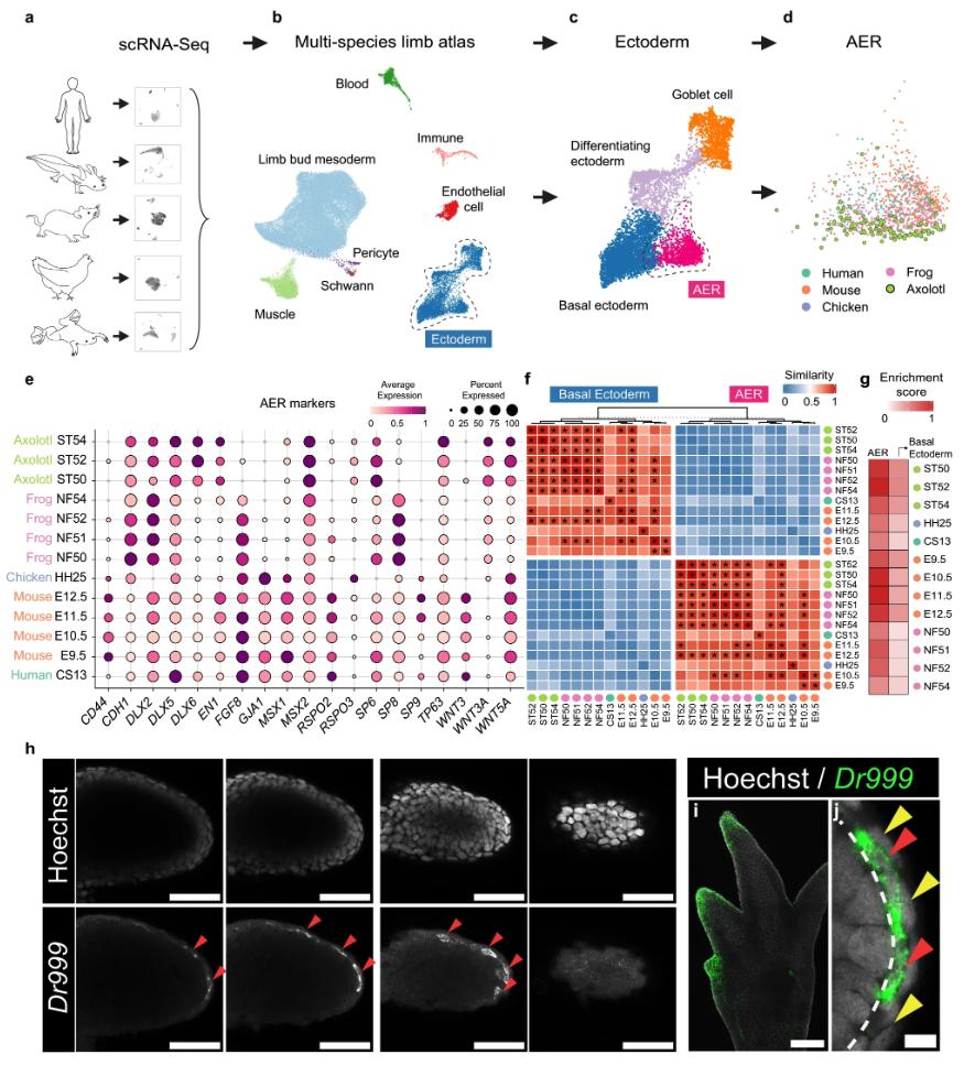 Fig. 1. a Schematic to generate a multi-species limb atlas using publicly available single-cell RNA-Seq (scRNA-Seq) datasets. b UMAP plot of Seurat-integrated multi-species limb atlas. Individual datasets from each species with different developmental stages are integrated. Dots are colored by cell identities. c UMAP plot of the ectodermal lineage. Dots are colored by cell identities. d UMAP plot of species contribution to the AER cluster. Dots are colored by species. e Dot plot showing AER marker expressions in AER cells from different species. The dot color indicates the mean expression that was normalized to the max of each dataset and to the max of each gene; the dot size represents the percentage of cells with non-zero expression. f Heatmap showing the MetaNeighbor score for pair-wise similarities of basal ectoderm and AER clusters. X- and Y-axes indicate species and developmental stages. Asterisks (*) denote the pairs with scores above 0.9. Source data provided as a Source data file. g Heatmap showing signaling ligands gene set enrichment analysis scores for AER, and non-AER basal ectoderm clusters. The basal ectoderm represents the transcriptome-wide most similar population to the AER, and is used for comparison. Colored dots in the Y-axis indicate different species. Source data provided as a Source data file. h Single optical section of z-stacks of confocal images of Stage 46 axolotl forelimb buds stained for Dr999-Pmt21178 (referred to as Dr999) mRNA via hybridization-chain-reaction (HCR). Different z-stacks were shown from left to right, representing different levels of the dorsal-ventral axis. (Top) Gray, Hoechst; Bottom Gray, Dr999 mRNA. Scale bar: 100 μm. i Max-projection confocal image of Stage 53 axolotl forelimbdigit tips stained for Dr999 mRNA via HCR. Green, Dr999 mRNA; Gray, Hoechst. Scale bar: 250 μm. j Zoomed single optical section image of the axolotl limb bud from (h) stained for Dr999 mRNA. Red arrows show Dr999+ squamous cells, and yellow arrows show outer layer peridermal cells. The basement membrane is labeled with a dashed line. Green, Dr999 mRNA; Gray, Hoechst. Scale bar: 10 μm.
