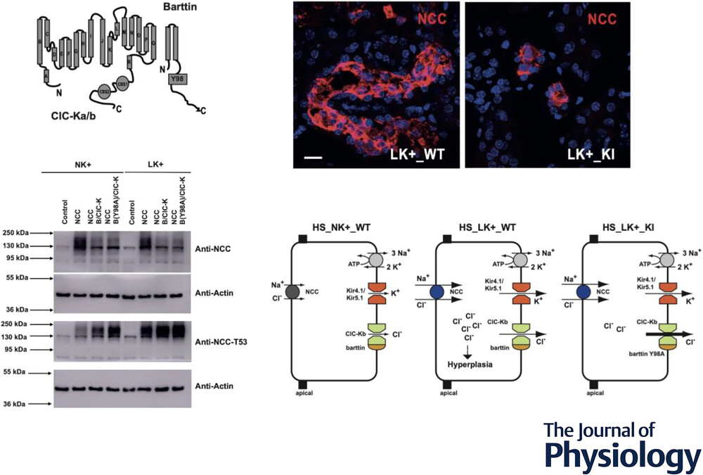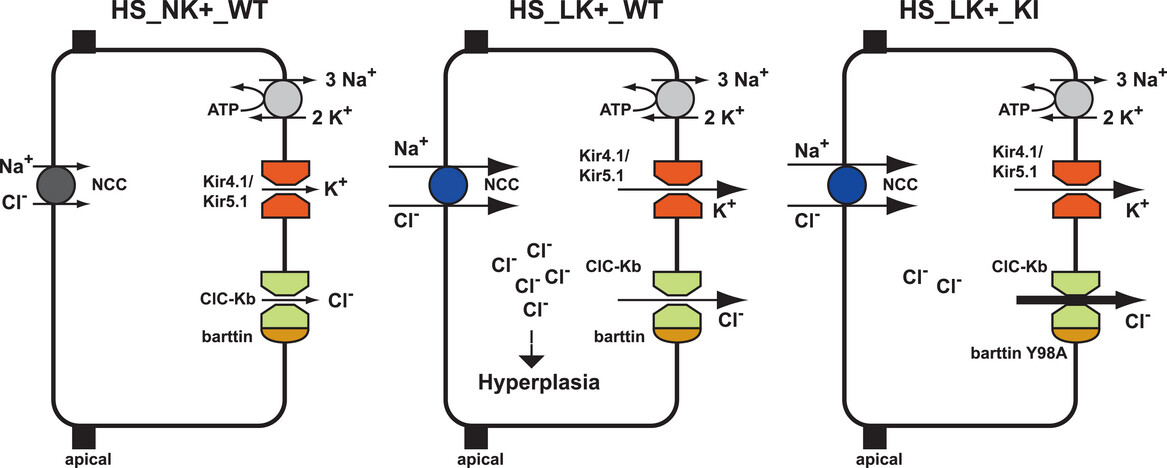 Proposed model to explain the KI reduced DCT hyperplasia. In the left panel, the model illustrates the WT behaviour under HSNK+ conditions. Mid and right: WT and KI mice under HSLK+ treatment. HSLK+ stimulating conditions lead to an increased NCC activity (as a result of both an increased stability and phosphorylation state, depicted as a change in the transporter from black to blue colour), triggering a rise in the Cl− and Na+ uptake. In the case of the WT mice (left), the activity of ClC-K/WT-barttin channels could be insufficient to mediate the needed Cl− efflux into the bloodstream, thus leading to Cl− accumulation in the cell cytoplasm. This could trigger a cell proliferation signal considered to be an alternative solution to overcome the Cl− reabsorption needs by increasing the total number of distal convoluted tubular cells involved. Conversely (right), the gain-of-function exhibited by the ClC-K/Y98A-barttin channels might mediate higher Cl− efflux, thus limiting its intracellular accumulation and the degree of cell proliferation triggered.