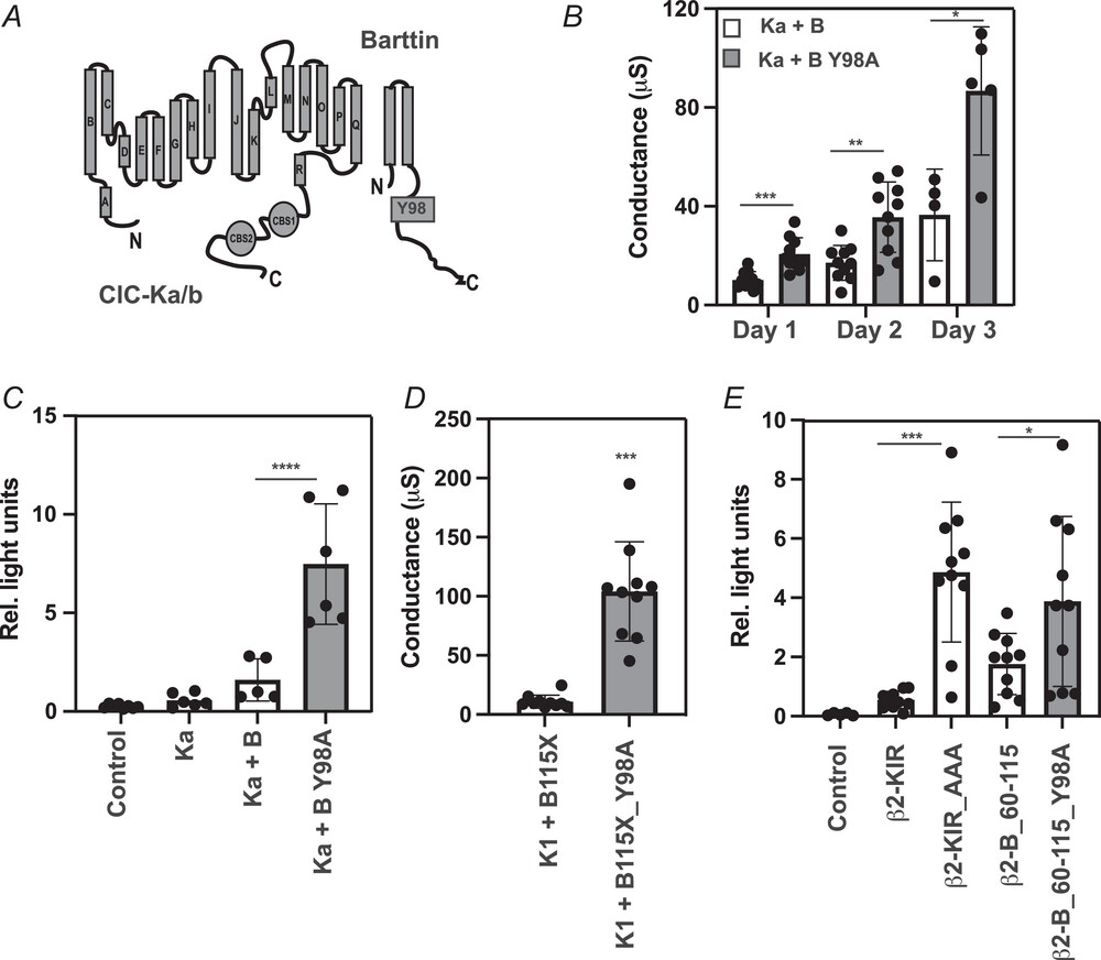A, schematic 2D models of the ClC-K chloride channel and barttin. The position of important structural features such as the helices and the cystathionine-β-synthase (CBS) domains are shown for the ClC-K protein. The localization of the N- and C-terminus is shown for both ClC-K and barttin proteins. The estimated position of the Y98 motif is highlighted in the barttin model. B, three-day time course of the conductance values mediated by ClC-Ka/barttin (Ka + B, white bars, n = 9, n = 9 and n = 4, for days 1, 2 and 3, respectively) or ClC-Ka/barttin containing the Y98A mutation (Ka + B Y98A, black bars, n = 9, n = 9 and n = 5, for days 1, 2 and 3, respectively), after co-expression in Xenopus oocytes. An unpaired t test showed significant differences between Ka + B and Ka + B Y98A groups (P < 0.0001, P = 0.00175 and P = 0.0141, for days 1, 2 and 3, respectively. C, chemiluminescence assay for ClC-Ka plasma membrane levels estimation of Control (n = 8), ClC-Ka (Ka, n = 6), Ka + B (n = 5) and Ka + B Y98A (n = 6) groups. One-way ANOVA with Bonferroni multiple comparison tests was performed to compare the different groups. P values (vs. Ka group): control (P > 0.999), Ka + B (P > 0.999) and Ka + B Y98A (P < 0.0001). Importantly, significant differences were also found between Ka + B and Ka + B Y98A groups (P < 0.0001), indicating that ClC-Ka PM levels were further enhanced by Y98A barttin. D, conductance values mediated by ClC-K1 in co-expression with the truncated 115X version of barttin (K1 + B115X, n = 10) or barttin 115X additionally containing the Y98A mutation (K1 + B115X_Y98A, n = 10). An unpaired t test showed significant differences between K + B115X and K1 + B115X_Y98A (P < 0.0001). E, chemiluminescence assay monitoring N-terminal HA-tagged ß2-adrenergic receptor PM levels. Groups include control (n = 5) and C-terminal fusion of different residues, as follows: C-terminus of the WT Kir6.2 channel (ß2-KIR, n = 10) or Kir6.2 three-alanine mutation of retention signal (ß2-KIR_AAA, n = 10), and residues 60 to 115 of WT barttin (ß2-B_60-115, n = 10) or containing the Y98A mutation (ß2-B_60-115_Y98A, n = 10). Data represent the mean ± SD. An unpaired t test showed significant differences between ß2-KIR and ß2-KIR_AAA (P < 0.0001) and between ß2-B_60-115 and ß2-B_60-115_Y98A (P = 0.0422). Significance: *P ≤ 0.05, **P ≤ 0.01 and ***P ≤ 0.001.
