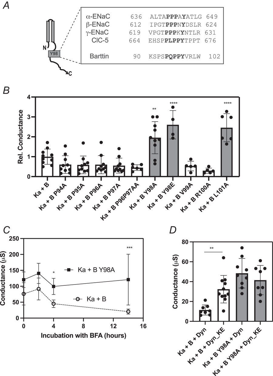 A, sequence magnification and alignment of the region surrounding and compressing the putative PY motif in barttin, ClC-5 and the ENaC channel. Motifs residues similarity is highlighted in bold letters. B, relative conductance values mediated by ClC-Ka in co-expression with WT barttin (n = 10) and different PY motif mutants. One-way ANOVA with Bonferroni multiple comparison tests was performed between the different groups. P values (vs. the Ka + B (WT) group): Ka + P94A (n = 10, P > 0.999), Ka + Q95A (n = 10, P > 0.999), Ka + P96A (n = 10, P > 0.999), Ka + P97A (n = 10, P > 0.999), Ka + P96P97AA (n = 6, P > 0.999), Ka + Y98A (n = 10, P = 0.0258), Ka + Y98E (n = 4, P < 0.0001), Ka + V99A (n = 5, P > 0.999), Ka + R100A (n = 5, P = 0.637) and Ka + L101A (n = 6, P < 0.0001). Groups showing enhanced conductance values are highlighted by black filled bars. In these groups, significance is indicated. C, time course of the conductance levels mediated by ClC-Ka/WT-barttin (Ka + B, n = 7, n = 8, n = 8 and n = 7, for incubation times of 0, 2, 4 and 14 h, respectively) and ClC-Ka/Y98A-barttin (Ka + B Y98A, n = 6, n = 10, n = 10 and n = 6, for incubation times of 0, 2, 4 and 14 h, respectively) in the presence of brefeldin A. One-way ANOVA with Bonferroni multiple comparison tests was performed to compare barttin WT vs. barttin Y98A effects at every brefeldin A incubation time. Significant differences were found after 4 h of incubation time: 0 h (P = 0.618), 2 h (P = 0.0966), 4 h (P = 0.0371) and 14 h (P < 0.001). D, conductance values mediated by ClC-Ka/WT-barttin (white bars) and ClC-Ka/Y98A-barttin (black filled bars) in co-expression with WT dynamin (Dyn) (n = 8 and n = 9, for WT and Y98A barttin variants, respectively) or dominant negative dynamin (Dyn_KE) (n = 11 and n = 8, for WT and Y98A barttin variants, respectively). One-way ANOVA with Bonferroni multiple comparison tests was performed comparing the dynamin variants effect. Significant differences were found for ClC-Ka/WT-barttin channels (P = 0.00918), whereas no significant differences were found for ClC-Ka/Y98A-barttin channels (P > 0.999). Data represent the mean ± SD. Significance: *P ≤ 0.05, **P ≤ 0.01 and ***P ≤ 0.001.