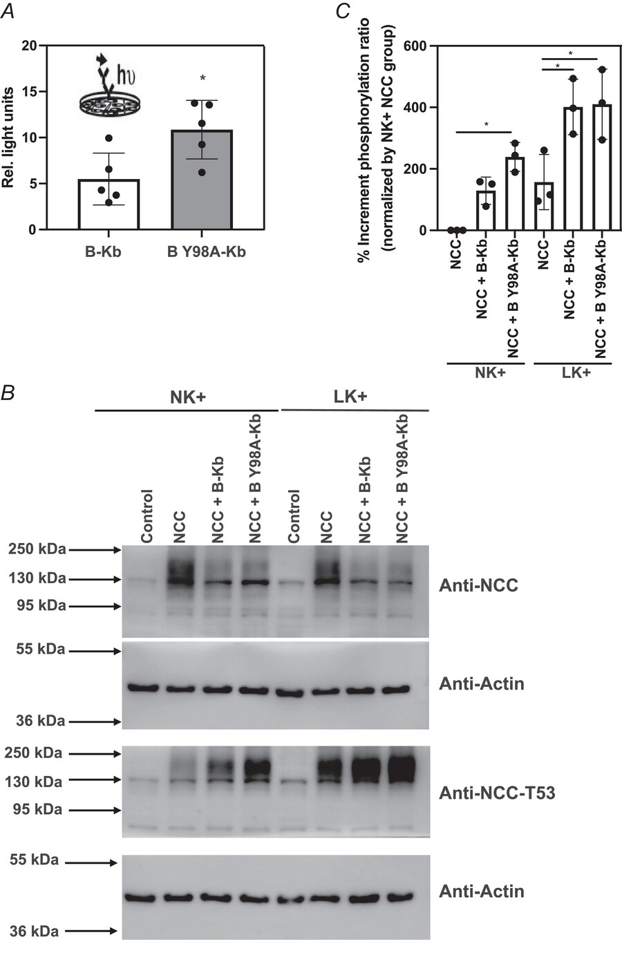 A, ClC-Kb relative PM levels estimation in both co-expression of WT-barttin (B-Kb, n = 5) or Y98A-barttin (B Y98A-Kb, n = 5). E2A fusion approach was applied to ensure the co-transfection of both barttin WT/Y98A and extracellular loop HA-tagged ClC-Kb channel proteins in all transfected cells. Data represent the mean ± SD. An unpaired t test showed significant differences between both groups (P < 0.0224). Significance: *P ≤ 0.05. Inset: illustration depicting the cell surface ELISA method selected to determine the relative PM levels of both groups (see methods). B, western blot detection of relative protein levels of NCC (Anti-NCC) and NCC phosphorylated at position Thr 53 (Anti-NCC-T53). Actin protein levels were detected as a loading control (Anti-Actin). Experiments were performed after expression of NCC alone or in co-expression with ClC-Kb/barttin (B-Kb) or ClC-Kb/Y98A-barttin (B Y98A-Kb) in HEK293T cells. Incubation conditions in normo-potassium (NK+) or low-potassium (LK+) medium are indicated at the top. C, western blot quantification of the increment (%) in the phosphorylation ratio of the NCC transporter (Th53/total NCC). Data of three independent experiments (n = 3) were normalized to the basal phosphorylation ratio exhibited by the NK+ NCC group. One-way ANOVA with Bonferroni multiple comparison tests was performed. P values of the comparison of every group between NK+ and LK+ conditions, were: NCC (P = 0.365), NCC + B-ClC-Kb (P = 0.0115) and NCC + BY98A-Kb (P = 0.234). Under NK+ conditions, no significant differences in the phosphorylation ratio of NCC were found after B-Kb co-expression (P = 0.839). Conversely, B Y98A-Kb co-expression significantly increased the phosphorylation ratio of NCC (P = 0.0307), displaying no significant differences vs. the B-Kb co-expression group (P > 0.999). Under LK+ conditions, both B-ClC-Kb (P = 0.0259) and B Y98A-Kb (P = 0.0199) co-expression significantly increased the phosphorylation ratio of NCC, and no significant differences were found between B-Kb and B Y98A-Kb groups (P > 0.999).