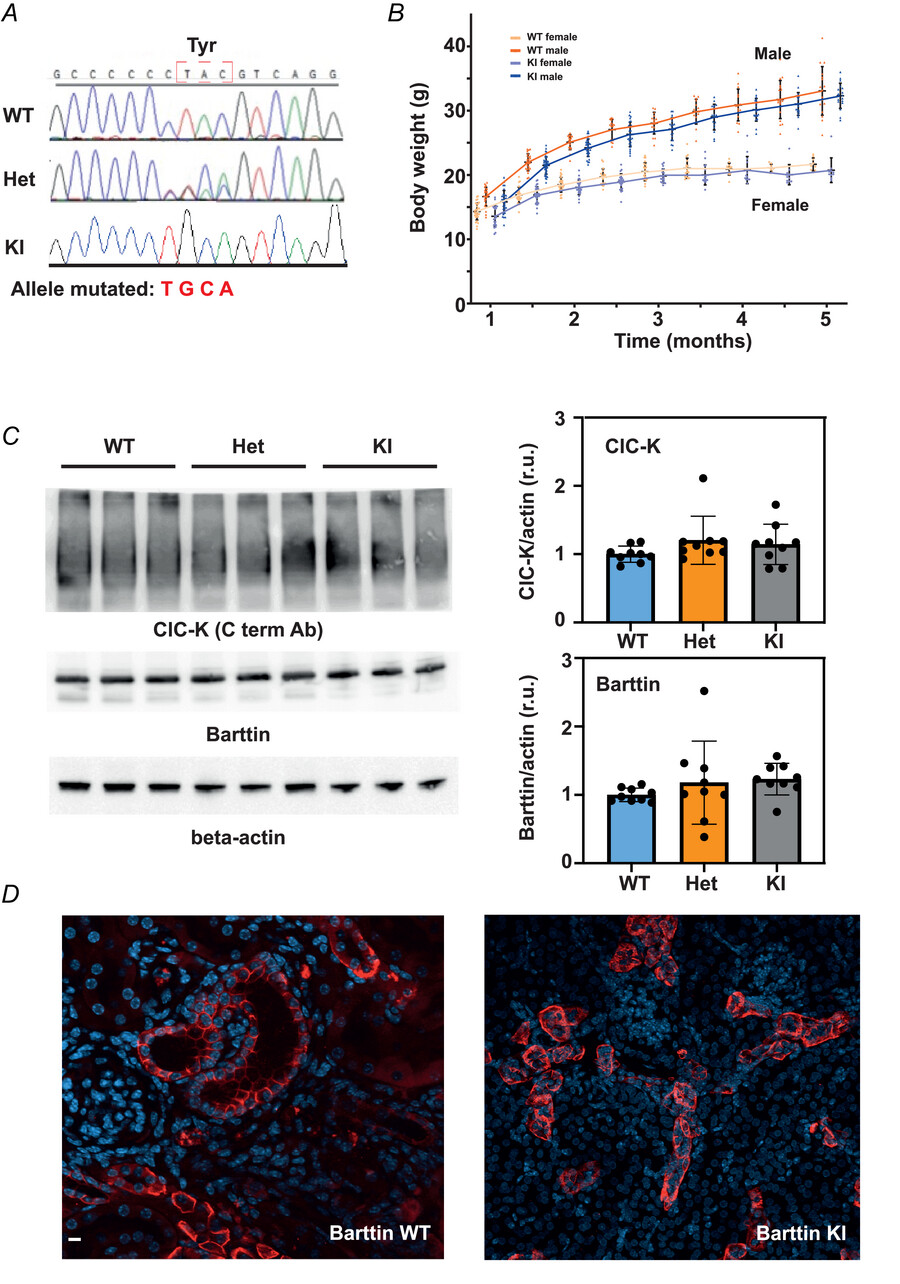 A, representative Bsnd sequences of wild-type (WT), heterozygous (Het) and knock-in (KI) mice. Changing the four nucleotides CTAC to TGCA by CRISPR-Cas9 results in the missense mutation p.Tyr95Ala. B, body weight evolution from the first to the fifth month of age, plotted by genotype and sex (n = 25). C, western blot detection (left) and quantification (right) of the relative protein levels of ClC-K2 and barttin proteins using our newly generated rabbit polyclonal antibodies. In the case of ClC-K2, the antibody against the synthetic C-terminal peptide was used (Rb#108). β-actin protein levels were detected as a loading control (beta-actin). A comparison of the renal tissue relative protein levels between WT, heterozygous (Het), and full knock-in mice (KI) is shown. Two bar diagrams show the normalized and β-actin corrected protein levels quantification of either the ClC-K2 channel and the barttin protein. Data represent the mean ± SD (n = 9 in every group, three replicates out of three independent animals from each mice model). One-way ANOVA with Bonferroni multiple comparison tests showed no differences in the protein levels among: WT vs. Het (P = 0.381 and P = 0.981, for ClC-K2 and barttin, respectively), WT vs. KI (P = 0.826 and P = 0.636, for ClC-K2 and barttin, respectively) and Het vs. KI (P > 0.999 for both ClC-K2 and barttin). D, immunohistochemical staining of barttin in WT and KI mice renal tissue. Images show that barttin is in the basolateral side in WT and KI mice. Scale bar = 20 µm. 4′,6-Diamidino-2-phenylindole (i.e. DAPI) nuclei staining (blue) is also shown to help identify individual cells.