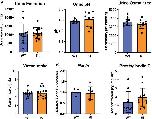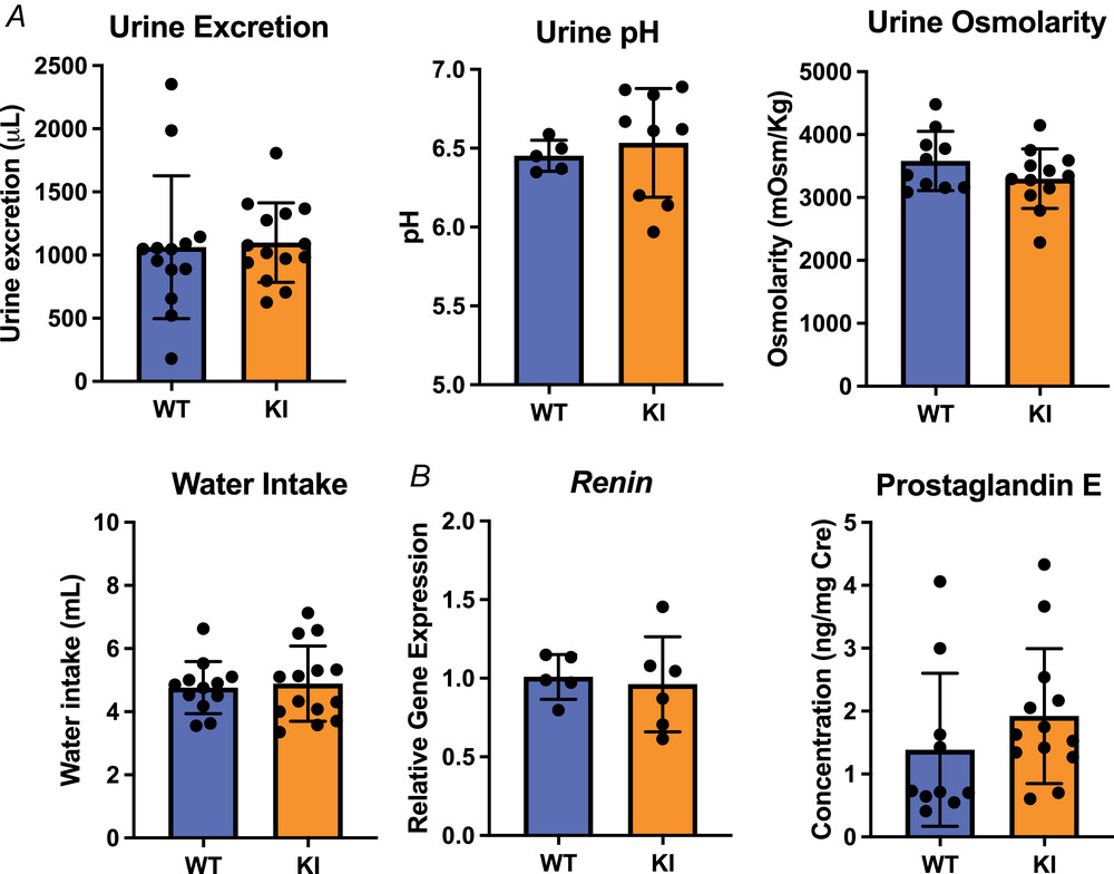 A, comparison of urine excretion, pH, osmolarity (Osm) and water intake between wild-type (WT) and knock-in (KI) mice was assessed during the days housed individually in metabolic cages (n = 11−14). Osmolarity levels were normalized by body weight (kg). Water intake was measured in mL. B, renin gene expression (n = 6−7) and PGE2 urinary normalized by mg of creatinine levels (n = 10−12). Data are expressed as the mean ± SD and each dot represents a different mouse. No statistical differences were found between WT and KI after a Mann–Whitney–Wilcoxon test: urine excretion (P = 0.550), pH (P = 0.364), osmolarity (P = 0.426), water intake (P = 0.910), renin gene expression (P = 0.166) and PGE2 (P = 0.604).