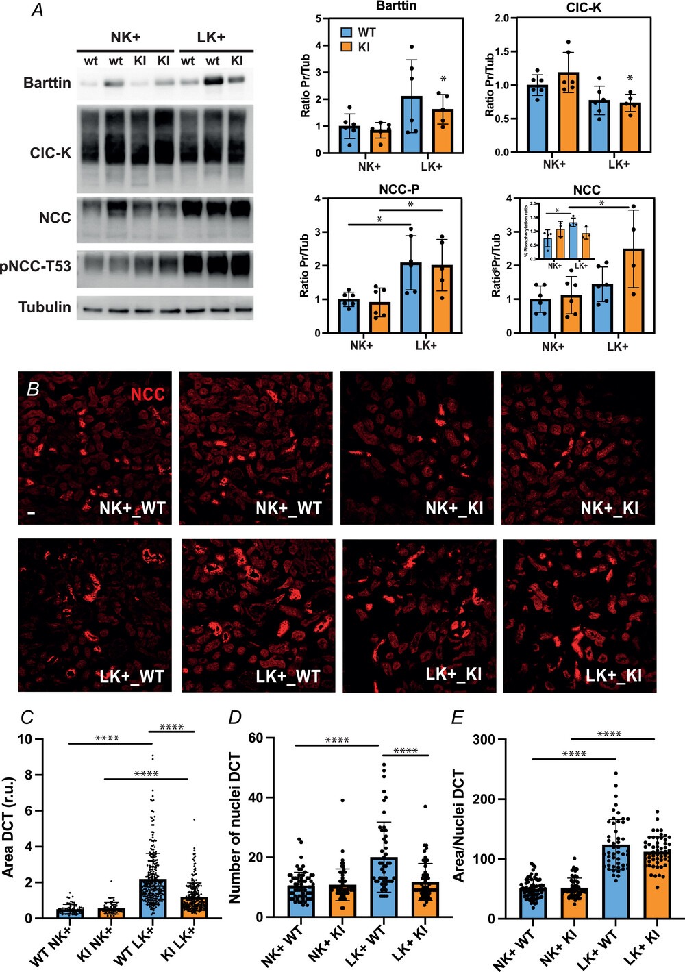 A, western blot detection (left) and quantification (right) of the renal tissue relative protein levels of barttin, ClC-K2, NCC and phosphorylated NCC (pNCC-T53 or NCC-P). Tubulin protein levels were detected as a loading control. A comparison of the relative protein levels between WT and KI mice in both HSNK+ (NK+) and HSLK+ (LK+) diets is shown. Four bar diagrams show the normalized and tubulin corrected protein levels quantification of each of the proteins. An inset small diagram depicts the NCC-P/NCC ratio calculated for every group. One-way ANOVA with Bonferroni multiple comparison tests was performed. No significant differences were found in the protein levels between WT (n = 6 in all the groups) and KI mice (n = 4 in the NCC LK+ group, n = 6 in all the groups under NK+ diet and n = 5 in the rest of the groups under LK+ diet). P values (NK+ and LK+) as follows: Barttin (P > 0.999 and P > 0.999), ClC-K2 (P = 0.868 and P > 0.999), NCC-P (P > 0.999 and P > 0.999) and NCC (P > 0.999 and P = 0.134). Conversely, LK+ diet triggered significant alterations of protein levels in some groups. P values (WT and KI) as follows: Barttin (P = 0.147 and P = 0.718), ClC-K2 (P = 0.479 and P = 0.0141), NCC-P (P = 0.0438 and P = 0.0515) and NCC (P > 0.999 and P = 0.0252). Bar diagrams represent the mean ± SD. Significance: *P ≤ 0.05. B, immunohistochemical staining of the NCC cotransporter (red) allows to compare the distal convoluted tubule areas between WT and full knock-in mice (KI) in both HSNK+ (NK+) and HSLK+ (LK+) diet conditions. Scale bar = 20 µm C–E, diagram graphs depicting the distal convoluted tubule area (C), number of nuclei quantifications (D) and area/nuclei quotient (E). One-way ANOVA with Bonferroni multiple comparison tests was performed. No significant differences were found in the distal convoluted tubule area between WT and KI mice fed with NK+ (P > 0.999, n = 66 and n = 61 for WT (n = 3 animals) and KI (n = 4 animals), respectively). Conversely, significant differences were found under LK+ diet (P < 0.0001, n = 285 and n = 239 for WT (n = 6 animals) and KI (n = 5 animals), respectively) diets. Furthermore, significant differences were found in the distal convoluted tubule area between NK+ and LK+ conditions, either in WT (P < 0.0001) and KI (P < 0.001) mice. Similarly, under NK+ diet, no significant differences were found in the quantified number of nuclei of distal convoluted tubules between WT (n = 66 ROIS, out of n = 3 animals) and KI mice (n = 61 ROIS, out of n = 4 animals) (P > 0.999); and, under LK+ diet, significant differences were found between WT (n = 48 ROIS, out of n = 5 animals) and KI mice (n = 55 ROIS, out of n = 5 animals) (P < 0.0001). Conversely, between NK+ and LK+ conditions, significant differences were found for the WT mice (P < 0.0001), whereas they were not significant for the KI (P > 0.999). In addition, no significant differences were found in the area/nuclei quotient between WT and KI mice fed with NK+ (P > 0.999, n = 66 and n = 61 for WT (n = 3 animals) and KI (n = 4 animals), respectively), or LK+ (P > 0.121, n = 48 and n = 55 for WT (n = 5 animals) and KI (n = 5 animals), respectively). Curiously, both WT and KI mice experienced a similar and significant increase in the area/nuclei quotient under LK+ diet (P < 0.0001 for both WT and KI). Significance: *P ≤ 0.05, **P ≤ 0.01, ***P ≤ 0.001 and ****P ≤ 0.0001.