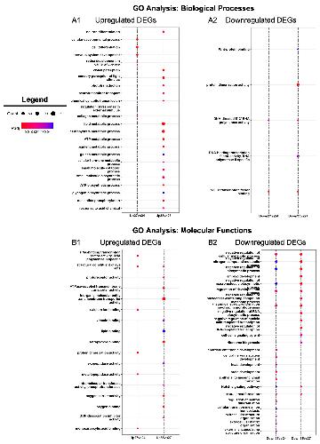 Figure 3. GO enrichment analysis. Gene Ontology (GO) analysis of statistically significantly differentially expressed genes (absolute log2 fold change ≥ 1 and FDR adj. p < 0.05) between consecutive developmental stages (st. 27 vs. 24 and st. 35 vs. 27). Enriched GO terms for (A) biological processes and (B) molecular functions.