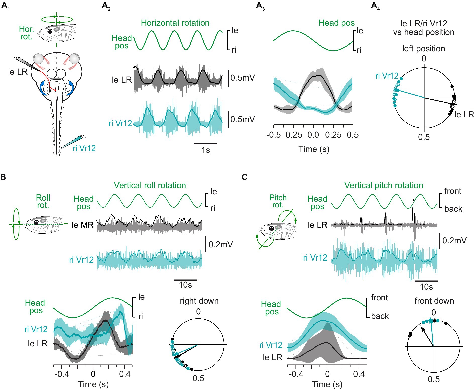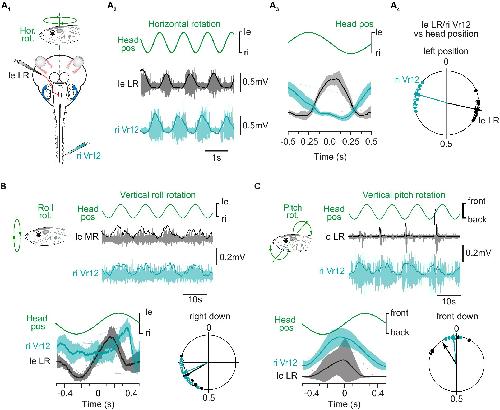 Figure 1. Spinal motor responses to vestibular endorgan natural stimulation. (A) Spinal ventral root (Vr; turquoise) and contralateral lateral rectus (LR; grey) nerve activity recorded in a semi-intact preparation (A1) in response to sinusoidal head rotations in the horizontal plan (A2) and corresponding mean discharges rates (A3) and phase relationships (A4) relative to head position. Plot in A3 shows mean responses averaged on 10 cycles for one animal. Circular diagram in A4 displays the phase distribution (dots) and mean vector (arrow) for each nerve activity in one typical animal. (B) Spinal ventral root and contralateral medial rectus (MR; grey) nerve activity recorded in response to sinusoidal head rolls in the vertical plan and corresponding mean discharge rates (bottom left) and phase relationships (bottom right) relative to head position. (C) Spinal ventral root and contralateral LR nerve activity recorded in response to sinusoidal head pitches in the vertical plan and corresponding mean discharge rates (bottom left) and phase relationships (bottom right) relative to head position. In A–C, the right ventral root 12 (riVr12) reflex discharge was compared to the well-known vestibulo-ocular response recorded simultaneously in either the left eye lateral or medial rectus motor nerve.