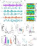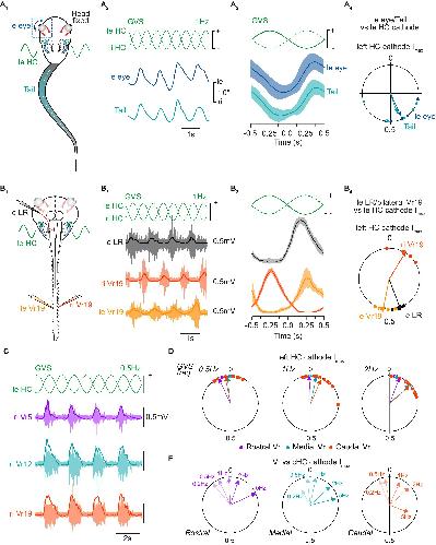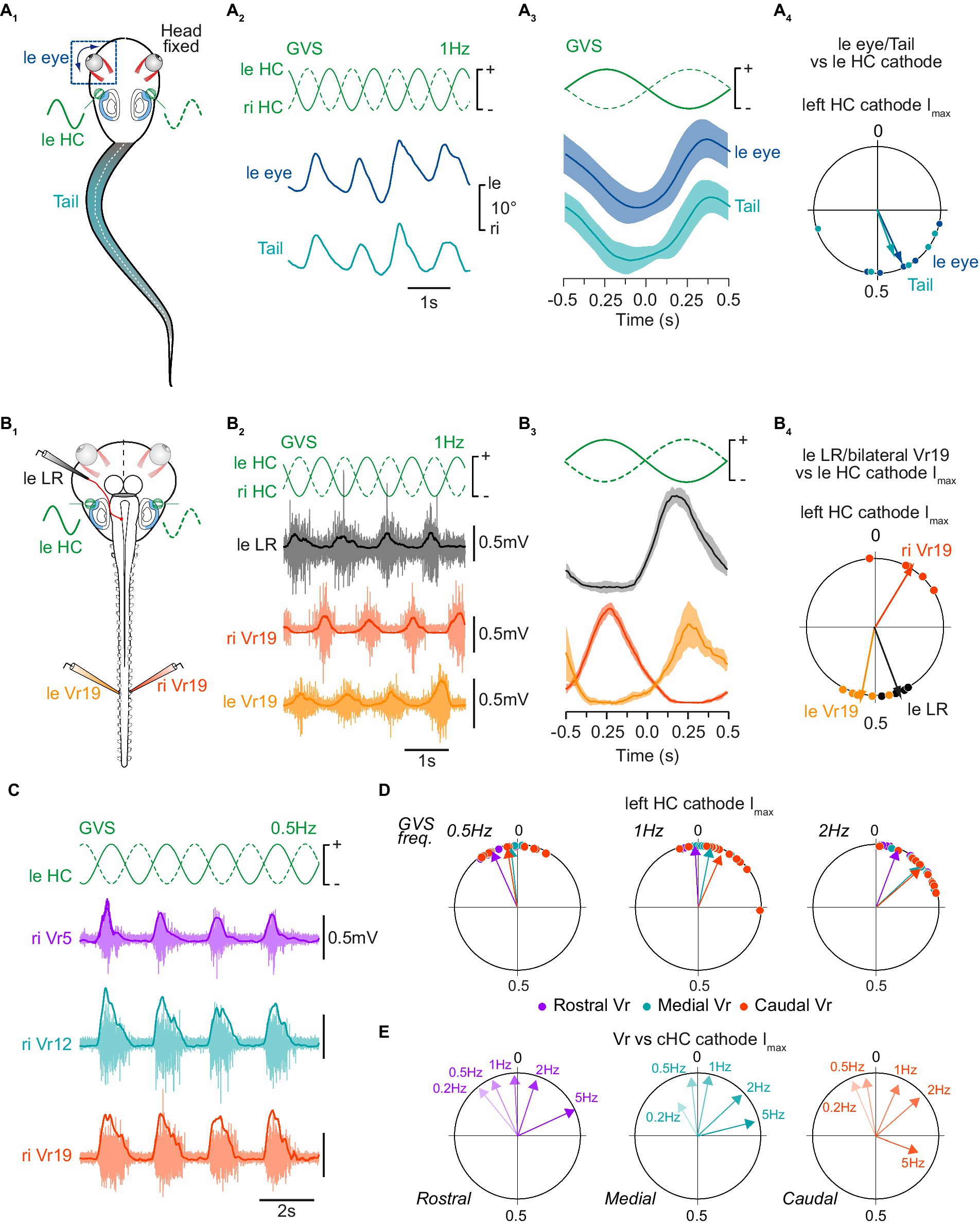 Figure 2. Tail postural and spinal motor responses to galvanic vestibular stimulation. (A) Tail postural adjustments (turquoise) and movements of the left eye (blue) recorded in head fixed in vivo preparations (A1) in response to sinewave galvanic stimulation (GVS) of horizontal canal cupula on left (leHC) and right (riHC) sides (A2), corresponding mean movements relative to the stimulus cycle (A3), and corresponding phase relationships relative to the maximal cathode stimulation current (Imax) of the left horizontal canal cupula (leHC, A4). Plot in A3 shows mean responses averaged on 10 cycles. Circular diagram in A4 displays the mean distribution of phases (dots) and mean vector (arrows) for tail and eye movements. (B) Bilateral distal ventral root (leVr19, riVr19; orange) and left lateral rectus (leLR; grey) nerve activity recorded in a semi-intact preparation (B1) in response to GVS stimulation of horizontal canal cupula (B2), corresponding mean discharge rates relative to GVS phase (B3), and corresponding phase relationships relative to the maximal left HC cathode current (B4). (C) Illustration of concomitant postural motor activity in right rostral (Vr5, purple), medial (Vr12, turquoise) and caudal (Vr19, orange) ventral roots in response to 0.5 Hz GVS. (D) Reflex response phase distribution and mean vector for all ventral roots relative to the maximal left cathode current at 0.5 Hz (left circular diagram), 1 Hz (middle circular diagram) and 2 Hz (right circular diagram). (E) Mean vectors for each ventral root reflex activity relative to 0.2, 0.5, 1, 2 and 5 Hz GVS sinusoidal Imax of the contralateral horizontal canal cupula (cHC).