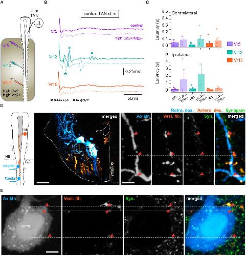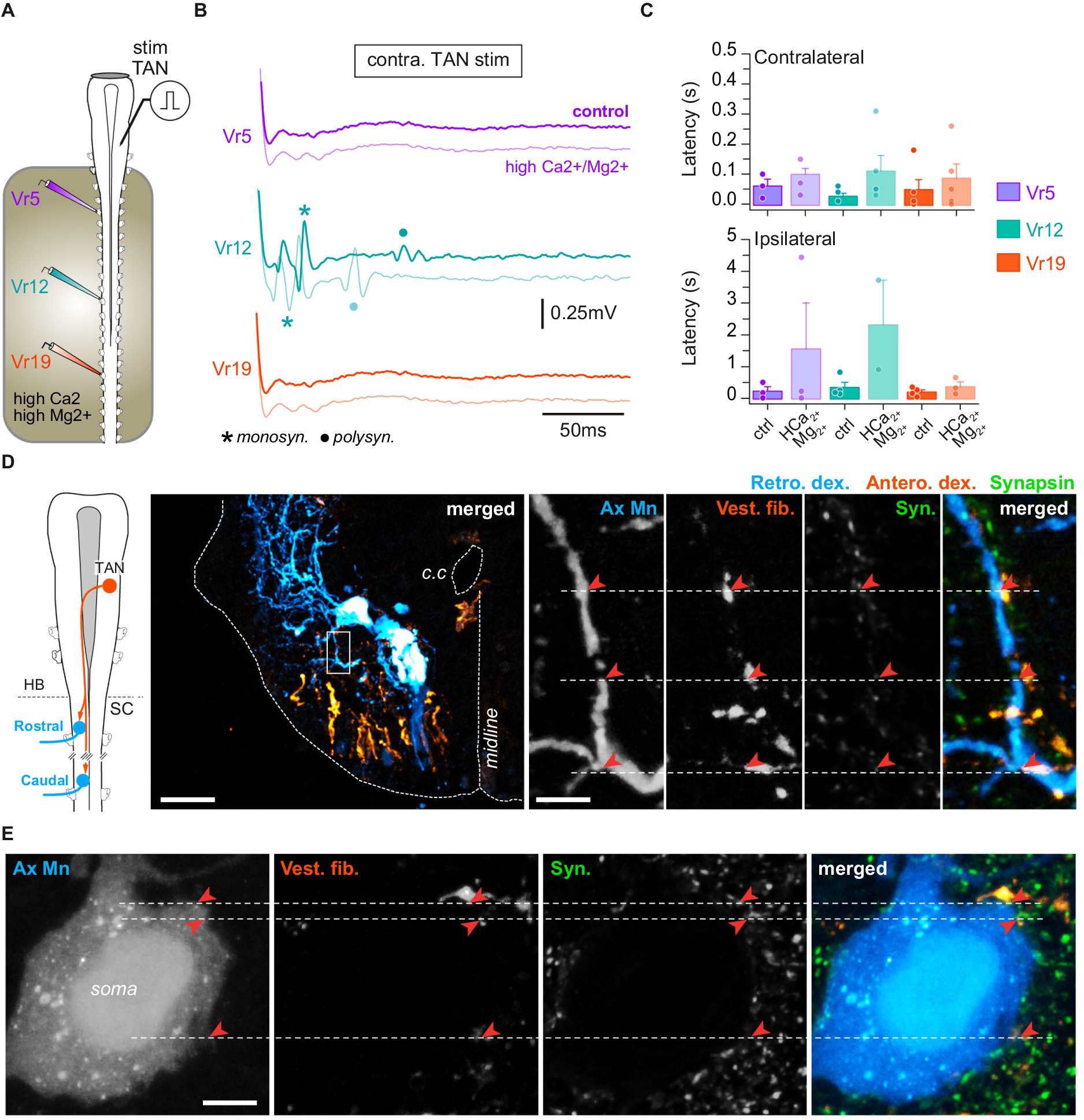 Figure 6. TAN inputs on spinal motoneurons. (A) Schematic of the semi-intact preparation used to record spinal ventral root responses to electrical stimulation of the TAN nucleus. (B) Trace examples of TAN-evoked motor responses in rostral (Vr5, purple), medial (Vr12, turquoise) and caudal (Vr19, orange) ventral roots before and during bath application of Ca2+/Mg2+-enriched saline restricted to the spinal cord. Monosynaptic (monosyn.) events are labeled with an asterisk and polysynaptic (polysyn.) events are labeled with a dot. (C) Averaged (mean ± SD) motor response latencies in contra- (top) and ipsilateral (bottom) rostral, medial and caudal Vr evoked by TAN electrical stimulation before and during Ca2+/Mg2+-enriched saline application. (D) Leftmost panel: CNS scheme depicting retrograde (Retro. Dex) labeling of rostral and caudal spinal motoneurons together with anterograde (Antero. dex.) labeling from the TAN. Left picture: confocal stack orthogonal projection of a spinal cross-section showing a retrogradely labeled caudal motoneuron and vestibulospinal terminals anterogradely labeled from the contralateral TAN. Right picture series: confocal magnification (×60) of the rectangle area drawn on the left picture illustrating, from left to right, axial motoneurons dendrites (Ax Mn), vestibulospinal fibers (Vest. Fib.), synapsin (syn.) immunofluorescence, and merge. Close signal appositions are pointed with red arrowheads. Scale bars in left picture and magnification are 100 μm and 10 μm, respectively. (E) Confocal magnification (×60) of an axial motoneuron soma (Ax Mn), vestibulospinal fibers (Vest. fib.), synapsin (Syn.) immunofluorescence, and merge. Close signal appositions are pointed with red arrowheads. Scale bar is 100 μm. c.c., central canal; HB, hindbrain; SC, spinal cord.