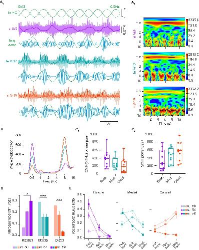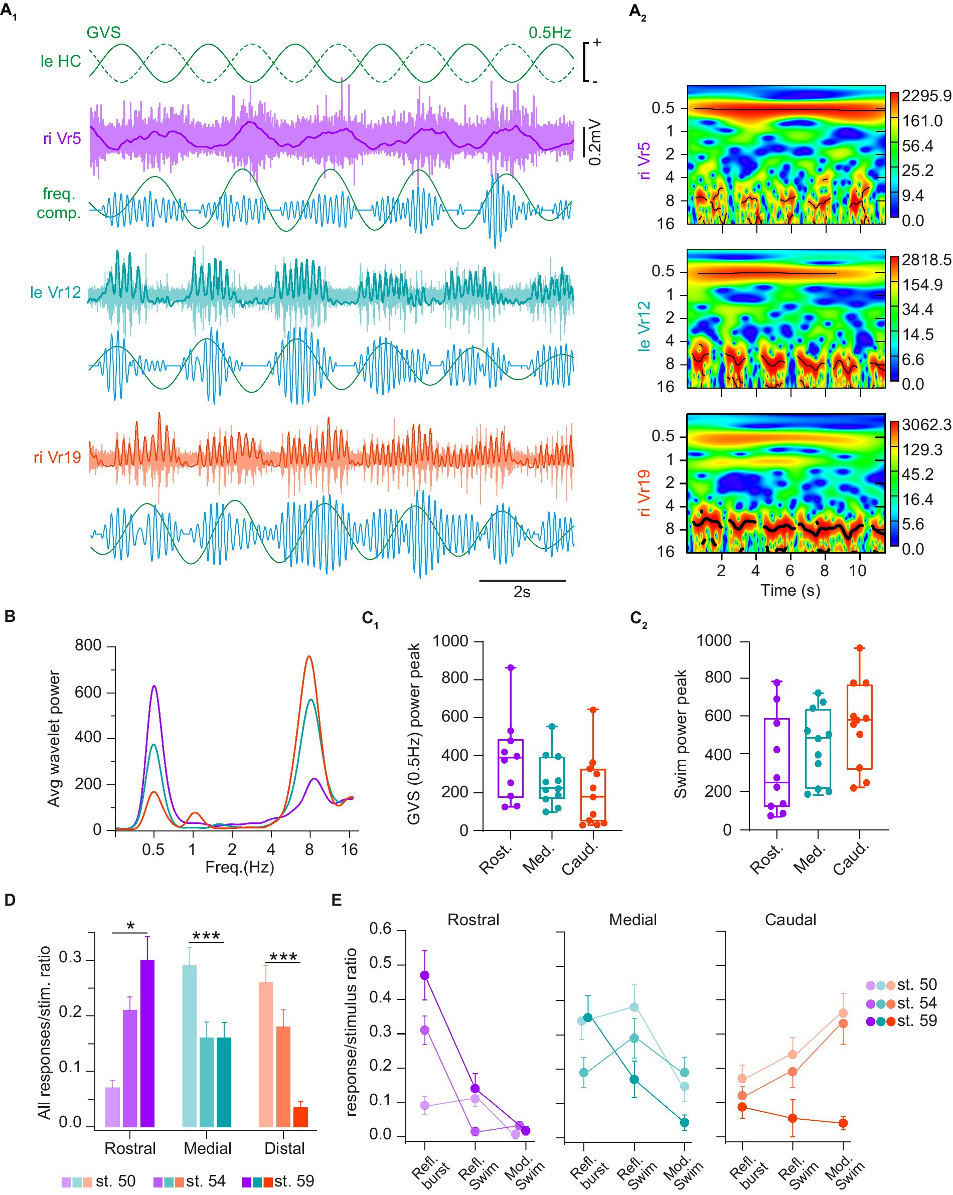 Figure 8. Horizontal canal activation evoked several types of spinal reflex responses. (A) Trace examples (A1) and corresponding wavelet analysis (wavelet reconstructions in A1 and power spectrum in A2) of vestibulospinal-evoked motor activity in rostral (Vr5, purple), medial (Vr12, turquoise) and caudal (Vr19, orange) right ventral roots (riVr) in response to GVS sinusoidal current stimulating the horizontal canal cupula (HC) at 0.5 Hz. In A1 for each Vr, upper traces show raw and integrated (bold line) nerve recordings, lower traces show wavelet reconstruction at 0.5 Hz (green) and 8 Hz (blue), corresponding to GVS and locomotor frequencies, respectively. (B) Periodogram of the average wavelet power for Vr recording example shown in A1. (C) Box plots of wavelet power peaks for 0.5 Hz GVS (C1) and swimming (C2) frequencies, respectively, in rostral (Rost.), medial (Med.) and caudal (Caud.) Vr. Upper and lower error bars represent maximum and minimum values, respectively. Bounds and center lines represent the values of 50% (75 and 25% percentile) and the median values, respectively. (D) Ratio of GVS-induced spinal responses of any types in rostral, medial and caudal Vr at larval stage 50, 54 and 59. (E) Ratio of GVS-induced reflex bursts (Refl. Burst), reflex swimming short events (Refl. Swim) and vestibular-modulated continuous swimming (Mod. Swim) in rostral (left), medial (middle) and caudal (right) Vr at larval stage 50, 54 and 59. See Table 1 for corresponding statistics.