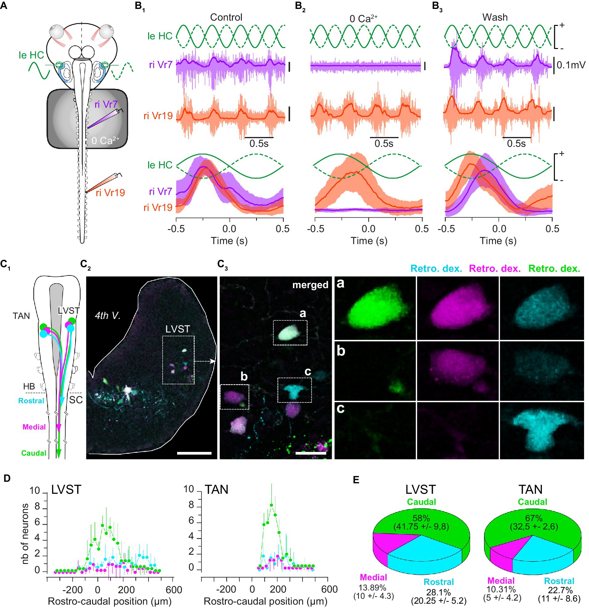 Figure 3. Vestibulospinal neurons project all along the spinal cord. (A) Schematic of the semi-intact preparation used to record GVS-evoked rostral and caudal spinal motor activity during bath application of a calcium free (0 Ca2+) ringer solution on the rostral cord (segments 1 to 10). (B) Example of 1 Hz GVS-evoked reflex motor activity (top) in rostral (Vr5, purple) and caudal (Vr19, orange) spinal ventral roots, and corresponding phase-related discharges averaged over 10 cycles (bottom) before (B1), during (B2) and after (B3) calcium-free perfusion. (C) Sequential retrograde dye application in caudal, medial and rostral spinal hemi-segments (C1) revealed LVST neurons in the brainstem (C2) projecting directly to caudal spinal segments (triple labeled neurons, inset “a” in C3), directly to medial segments (double labeled neurons, inset “b” in C3) and to rostral segments (single labeled neurons, inset “c” in C3). Similar observation was made for TAN neurons (not illustrated). (D) Rostro-caudal distribution (mean ± SD) of LVST (left graph) and TAN neurons (right graph) projecting to caudal (green), medial (pink) and rostral (cyan) spinal segments. The 0 μm position corresponds to the VIIIth nerve rostral entrance in the brainstem. (E) Proportion (mean ± SD) of LVST (left pie chart) and TAN neurons (right pie chart) projecting to caudal (green), medial (pink) and rostral (cyan) spinal segments. 4th V., 4th ventricle; LVST, lateral vestibulospinal tract nucleus; TAN, tangential nucleus; Retro. Dex., retrograde dextran-coupled dye; HB, hindbrain; SC, spinal cord; nb, number. Scale bar is 100 μm in C2 and 25 μm in C3.