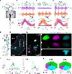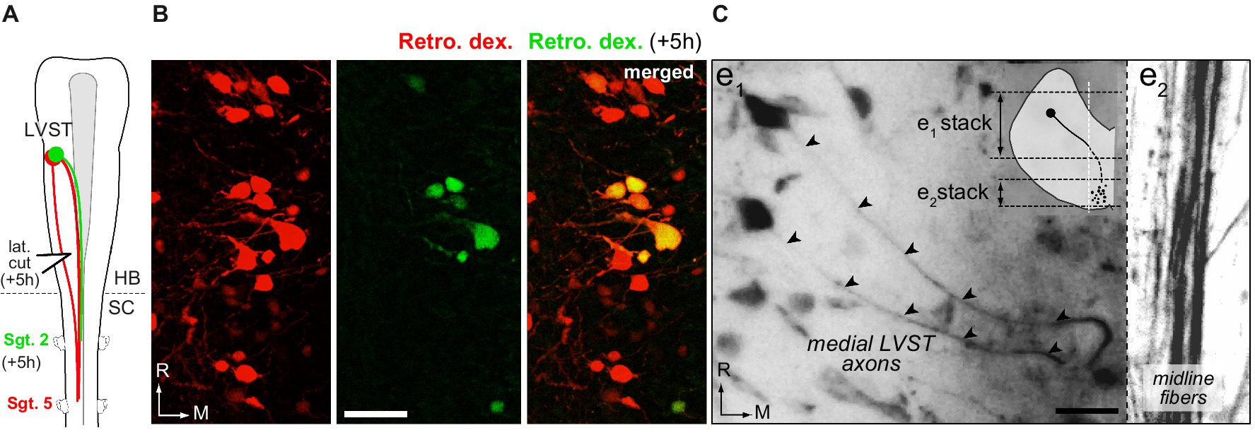 Figure 4. Lateral and medial trajectories of LVST axons in the brainstem. (A,B) Sequential application of retrograde dyes in spinal hemi-segments (Sgt.) 5 and 2 with an in-between lateral cut (lat. cut) in the caudal brainstem (A) revealed a subpopulation of LVST neurons projecting medially within the brainstem (B, double labeled cell bodies). (C) Trajectory of LVST axons (arrowheads) going directly to the midline visualized in whole brainstem preparation treated with CLARITY. Two confocal stack projections (see schematic in inset) at two different depths in the same brainstem area respectively illustrate the initial axon courses toward the midline (e1) and the bundle of LVST axons running parallel to the midline. Retro. dex., retrograde dextran dye; HB, hindbrain; SC, spinal cord; R, rostral; M, medial. Scale bar is 20 μm in B,C.