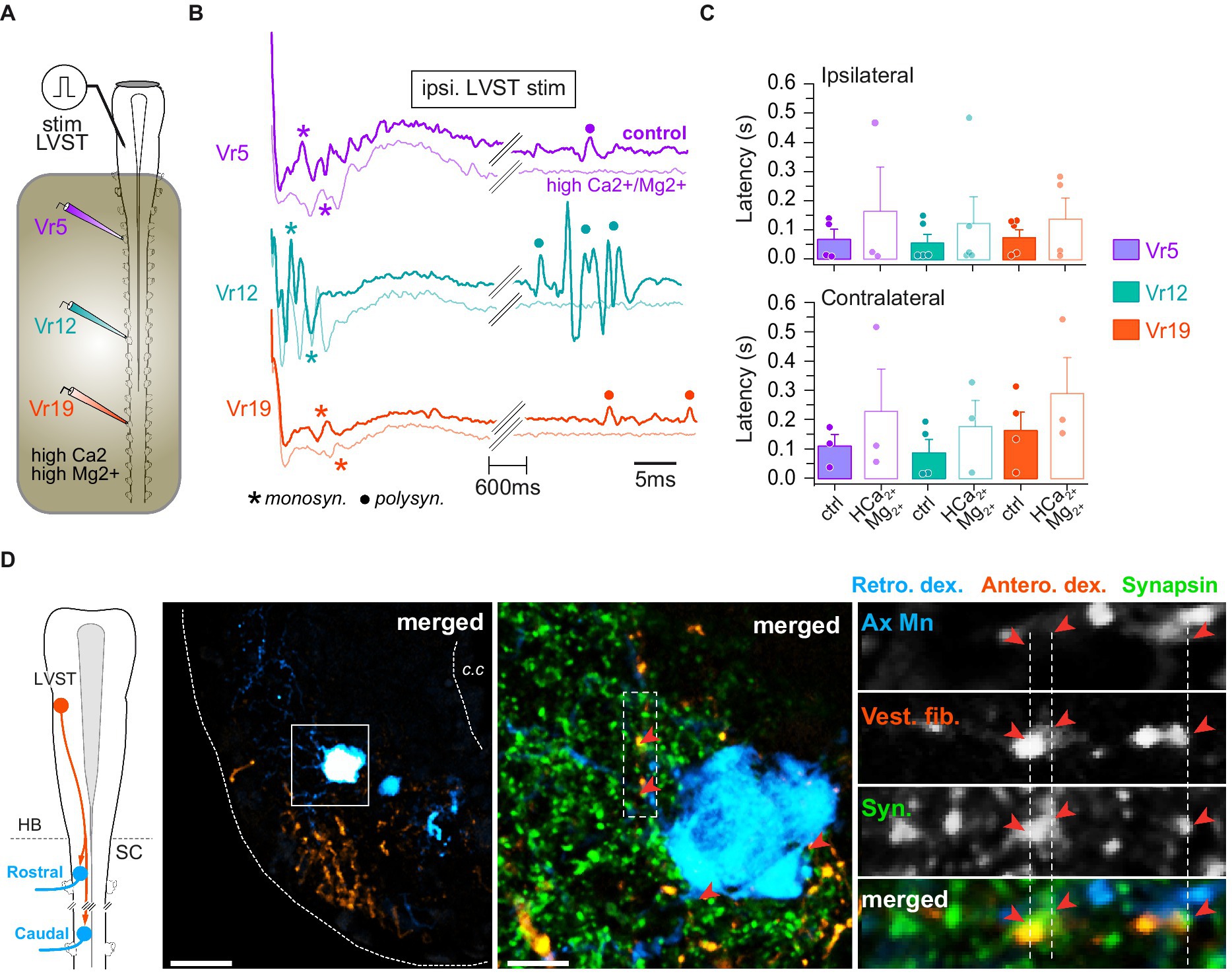 Figure 5. LVST inputs on spinal motoneurons. (A) Schematic of the semi-intact preparation used to record spinal ventral root responses to electrical stimulation of the LVST nucleus. (B) Trace examples of LVST-evoked motor response in rostral (Vr5, purple), medial (Vr12, turquoise) and caudal (Vr19, orange) ventral roots before and during bath application of Ca2+/Mg2+-enriched saline restricted to the spinal cord. Monosynaptic (monosyn.) events are labeled with an asterisk and polysynaptic (polysyn.) events are labeled with a dot. (C) Averaged (mean ± SD) motor response latencies in ipsi- (top) and contralateral (bottom) rostral, medial and caudal Vr evoked by LVST electrical stimulation before and during Ca2+/Mg2+-enriched saline application. (D) Leftmost panel: CNS scheme depicting retrograde (Retro. Dex) labeling of rostral and caudal spinal motoneurons together with anterograde (Antero. dex.) labeling from the LVST. Left picture: confocal stack orthogonal projection of a spinal cross-section showing a retrogradely labeled caudal motoneuron and vestibulospinal terminals anterogradely labeled from the ipsilateral LVST. Middle picture: magnification (×40) of the square area drawn on the left picture with synapsin immunofluorescence labeling. Right picture column: confocal magnification (×60) of the rectangle dashed area drawn on middle picture illustrating, from top to bottom, axial motoneurons dendrites (Ax Mn), vestibulospinal fibers (Vest. Fib.), synapsin (syn.) immunofluorescence, and merge. Fluorescence signal close appositions are pointed with red arrowheads. Scale bars in left and middle pictures are 50 μm and 10 μm, respectively. c.c., central canal; HB, hindbrain; SC, spinal cord.