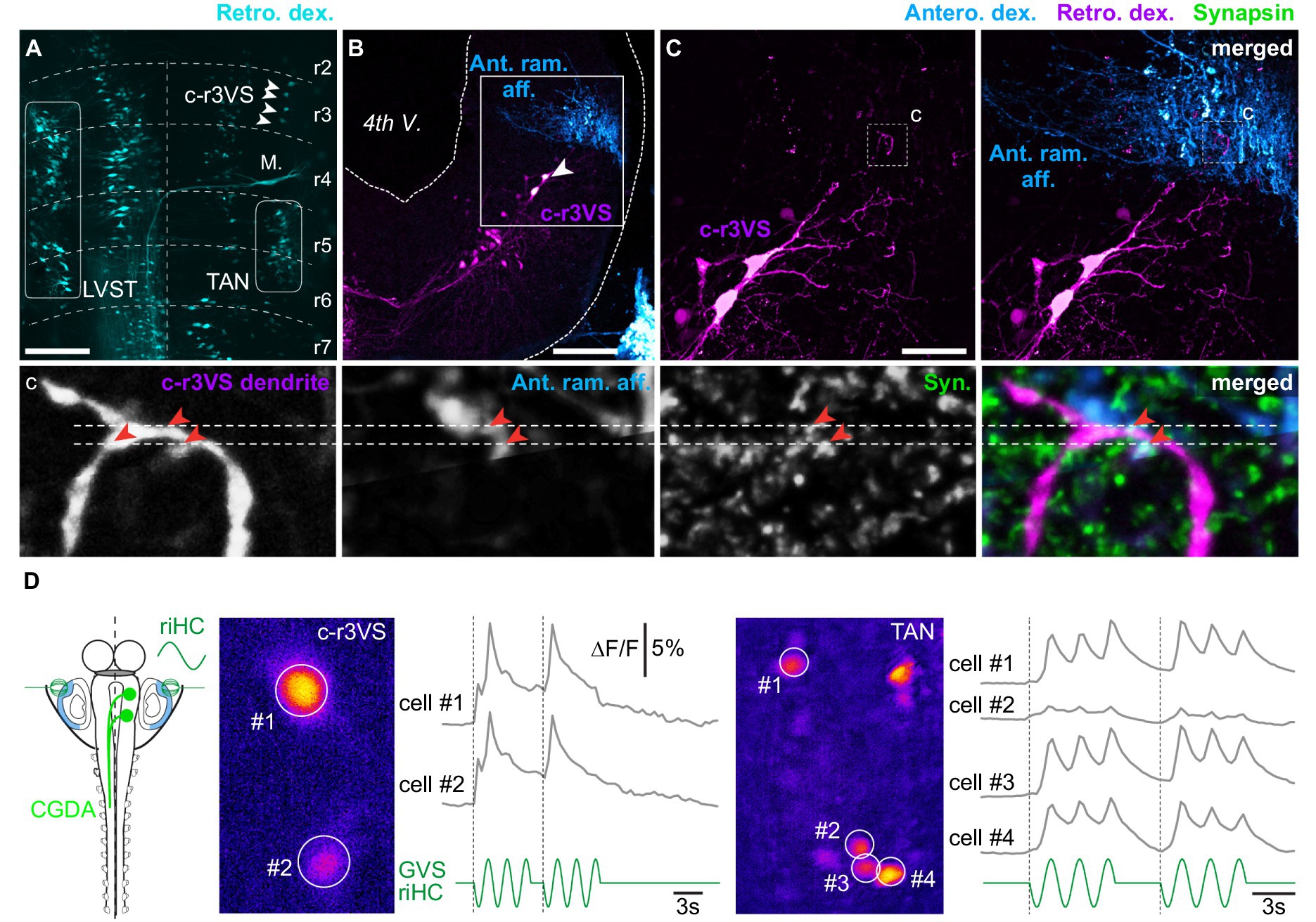Figure 7. Vestibulospinal neurons located in contralateral rhombomere 3. (A) Orthogonal projection of a confocal image stack of a brainstem whole-mount preparation showing vestibulospinal neuron populations retrogradely labeled from the left hemi-cord. White arrowheads indicate vestibulospinal neurons located in the rhombomere 3 (r3), just above the Mauthner cell (M.), and projecting in the contralateral spinal cord (c-r3VS, contralateral rhombomere 3-located vestibulospinal neurons). (B) Orthogonal projection of a confocal image stack of a brainstem cross-section showing retrogradely labeled c-r3VS neurons and vestibular terminals anterogradely labeled from the anterior ramus VIIIth nerve branch (Ant. ram. aff.) on the same side. (C) Magnifications (×40) of square area in B: left panel displays retrogradely labeled c-r3VS neurons only; right panel shows anterogradely labeled anterior ramus vestibular afferents in addition. Bottom picture series display confocal magnifications (×60) of the “c” dashed square area in C illustrating, from left to right, dendrites from c-r3VS neurons, vestibular afferent fibers from the anterior ramus nerve branch, synapsin (syn.) immunofluorescence, and merge. Red arrowheads point to close appositions of fluorescent signals. Scale bars in A–C pictures are 100 μm, 100 μm and 50 μm, respectively. (D) Calcium transients elicited in c-r3VS (left panel, pseudocolor image) and TAN neurons on the same side (right panel) in response to 0.25 Hz GVS sinusoidal current in a semi-intact preparation (left scheme) where vestibulospinal neurons were retrogradely labeled by calcium green dextran-amine (CGDA) and GVS electrode were positioned in order to stimulate horizontal canal cupula. riHC, right horizontal canal cathode.