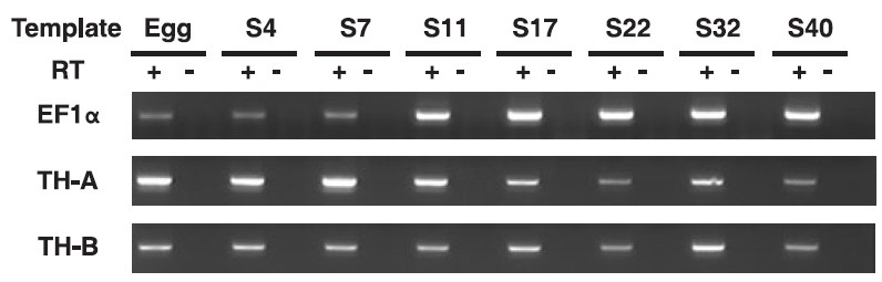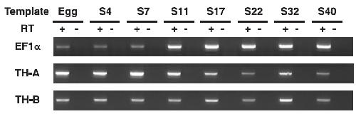 as template for each reaction. PCR reactions for the amplification of TH-B were also performed in the absence of reverse transcriptase (-RT) to