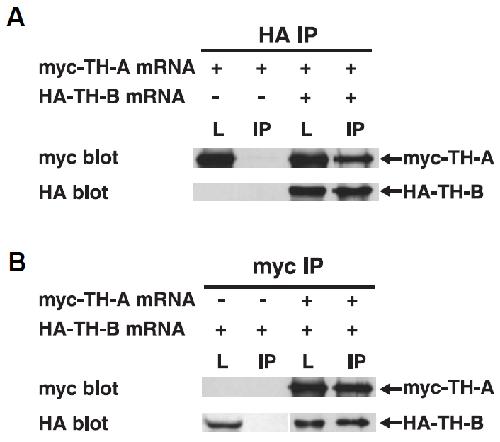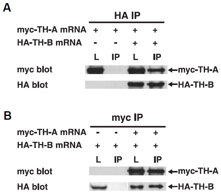 were removed to analyze the expression of the myc-TH-A and HA-TH-B