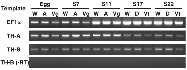 Total RNA preparations were made from cell extracts from whole (W) embryos or the embryos that were dissected. Expression of the TH-A and THB