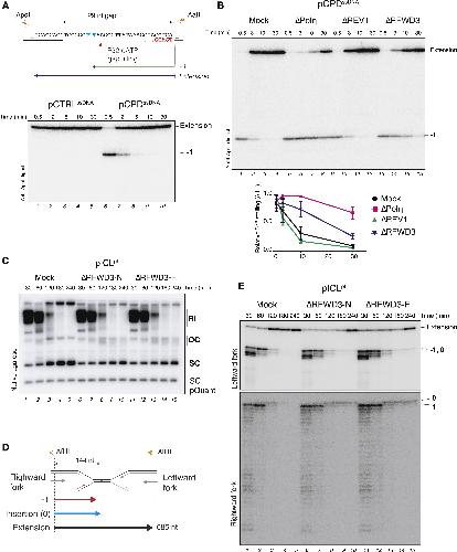 (C) pFpgssDNA was incubated in mock- or RFWD3-depleted non-licensing extracts (also depleted of SPRTN) for the indicated time points and samples processed as in (A).