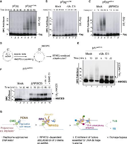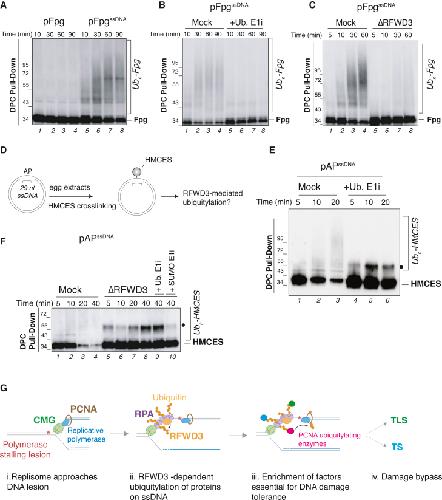 (A) Fpg bacterial glycosylase was crosslinked to either double-stranded (pFpg) or single-stranded DNA (pFpgssDNA) and added to SPRTN-depleted non-licensing egg extracts. DPC pull-down under stringent conditions was performed at the indicated time points, and samples were blotted against crosslinked Fpg. Slow mobility bands represent ubiquitylated Fpg species (see B).
