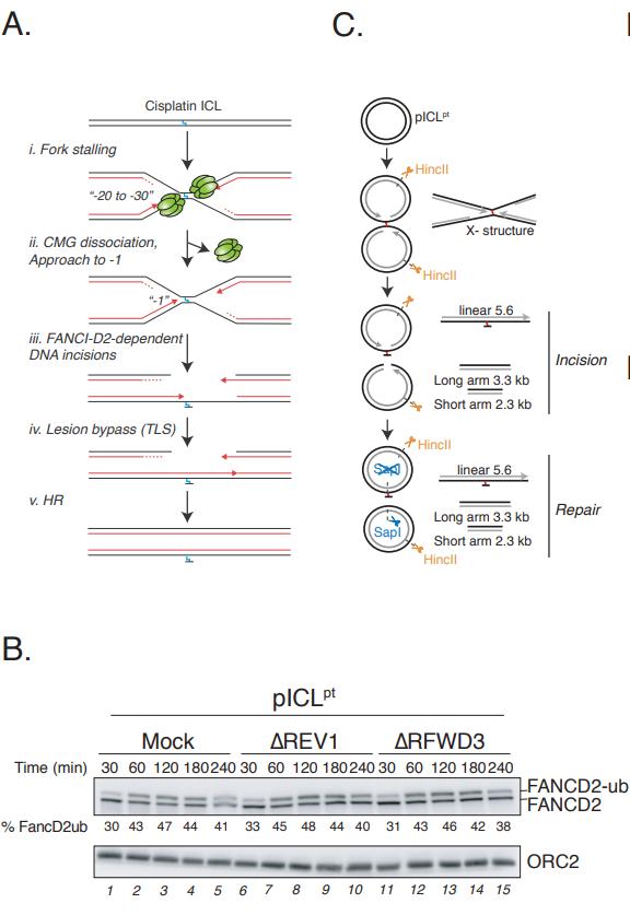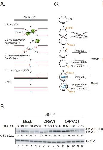 model of pICLPt repair in egg extracts. (B) pICLpt was replicated in mock-, REV1- or RFWD3-depleted