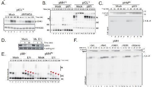 (B) pMH or pMHPK were replicated in the presence or absence of ubiquitin E1 inhibitor. Reaction samples were digested and analyzed as in Figure 1E.