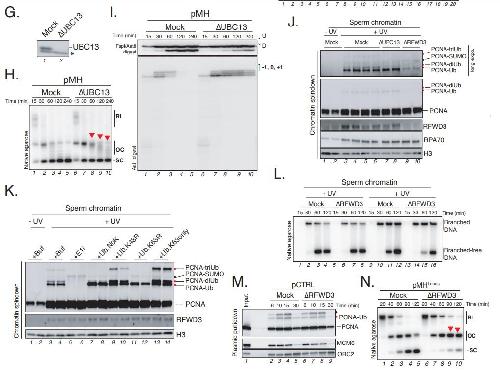 UBC13 depletion specifically abrogates PCNA poly-ubiquitylation. (K) Sperm chromatin was either