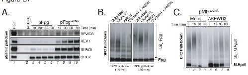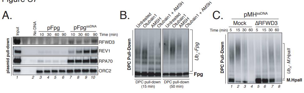 Figure S7. RFWD3 ubiquitylates proteins on ssDNA. Related to Figure 7. (A) pFpg or pFpgssDNA