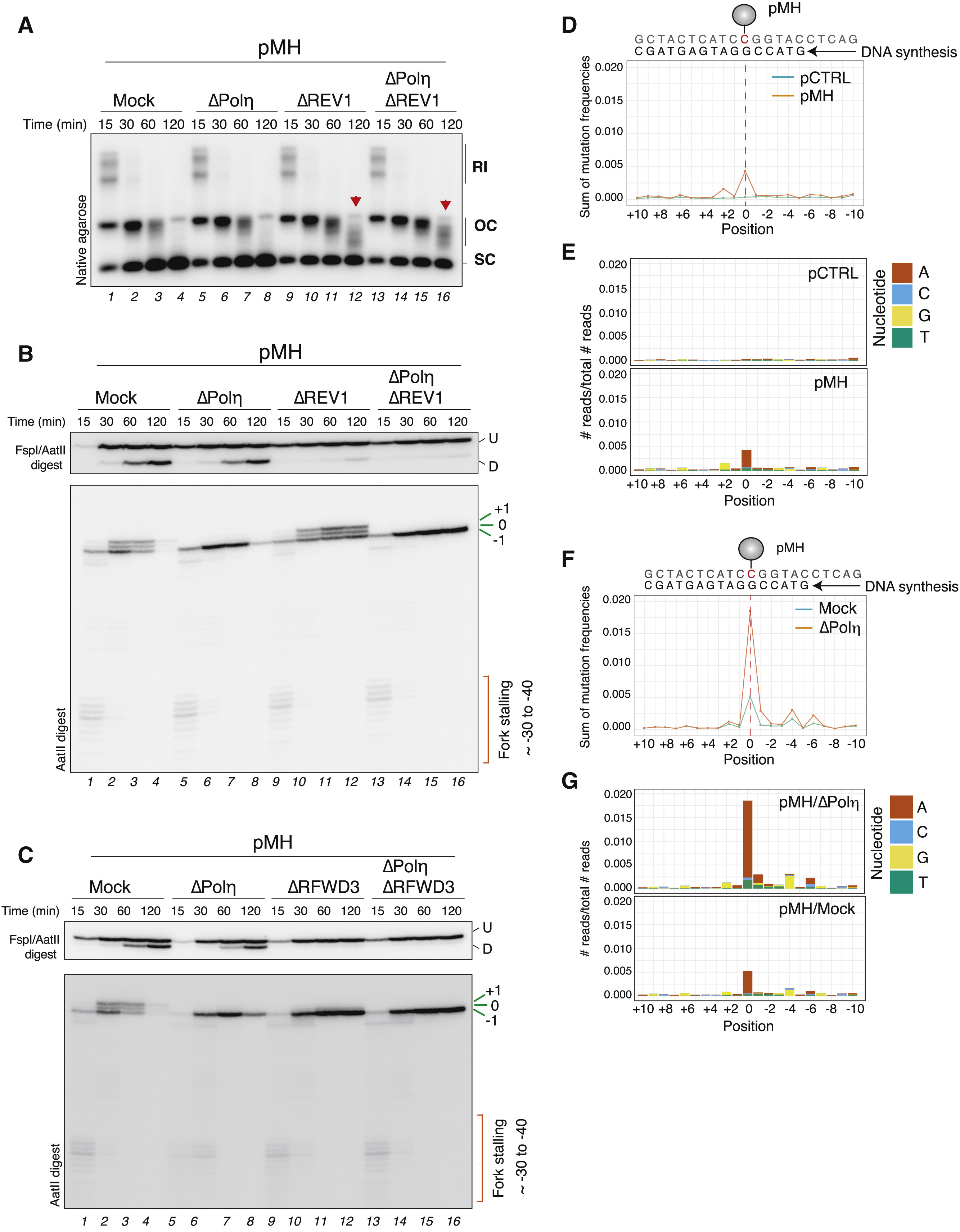 Figure 2. Replication of pMH is a two-step mutagenic process(A) pMH was replicated in mock-, Polη-, REV1-, or Polη- and REV1-depleted extracts. Samples were analyzed as in Figure 1C.(B) Samples from (A) were digested and analyzed as in Figure 1E. U, undamaged strand; D, damaged strand.(C) pMH was replicated in mock-, Polη-, RFWD3-, or Polη- and RFWD3-depleted extracts. Samples were analyzed as in Figure 1E.(D) Quantification of mutation frequencies measured after replication of pCTRL or pMH. Replication samples were amplified by PCR and analyzed by next-generation sequencing (see STAR methods). The 0 position corresponds to the location of the protein adduct. One of three independent experiments is shown.(E) Distribution of nucleotide misincorporation from the data generated in (D).(F) pMH was replicated in either mock- or Polη-depleted extracts, and samples were amplified and analyzed as in (D). One of three independent experiments is shown.(G) Distribution of nucleotide misincorporation from the data generated in (F).