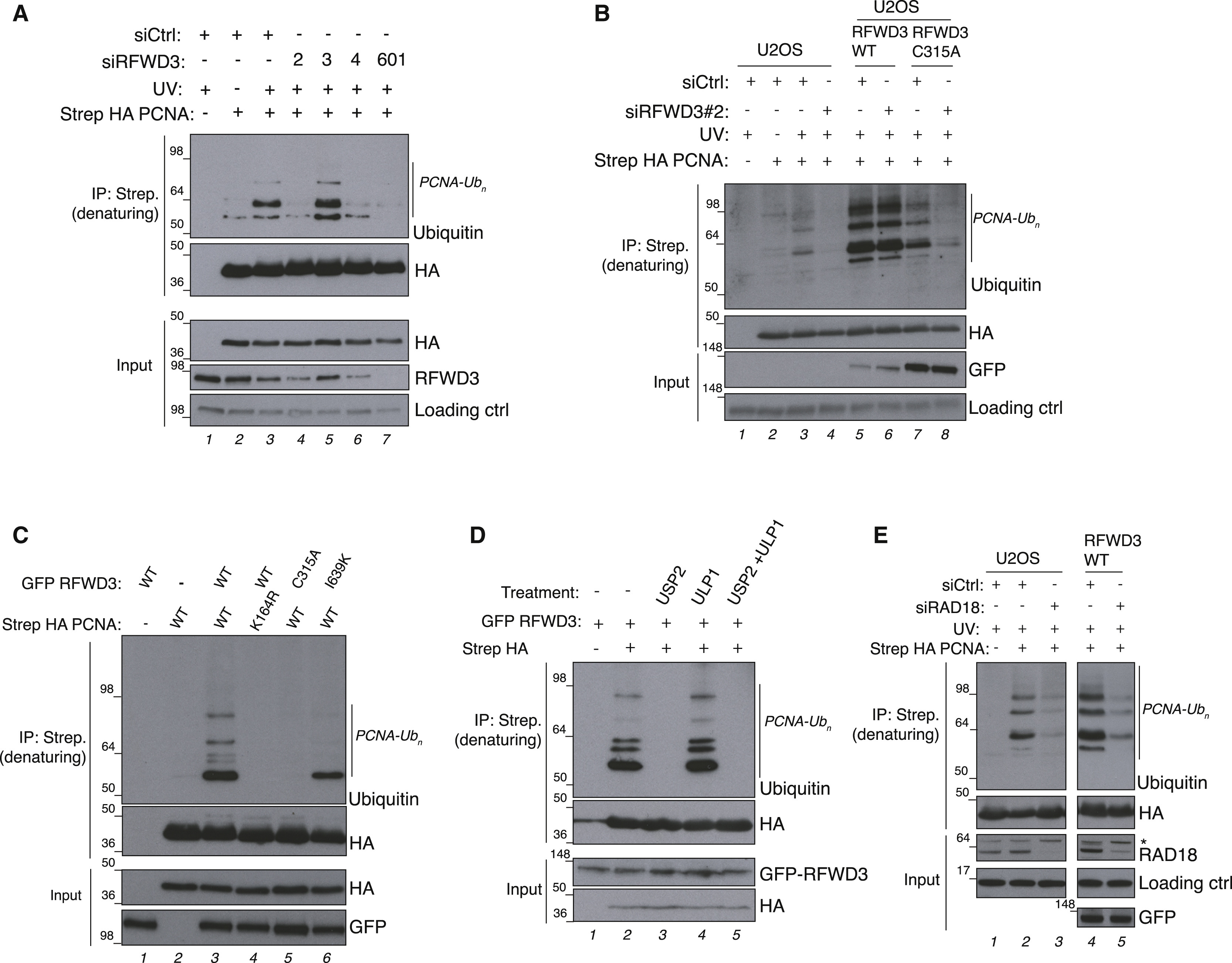 (A) U2OS cells or U2OS cells expressing Strep-HA-PCNA were transfected with siCtrl or 4 different siRNAs against RFWD3 and either left untreated or treated with UV (30 J/m2). PCNA was recovered under denaturing conditions via Strep-Tactin pull-down and analyzed by immunoblotting with the indicated antibodies.
