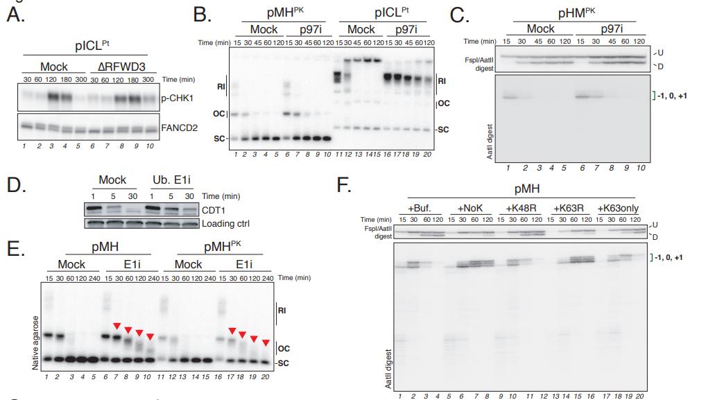 E1 inhibitor (MLN7243) to block de novo ubiquitylation. Samples were analyzed by agarose gel electrophoresis as in Figure 1C. Red arrows indicate persisting OC molecules. (F) pMH was