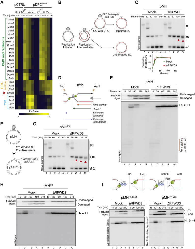 Figure 1. RFWD3 is essential for TLS across peptide adducts(A) Heatmap depicting the mean of the Z score, log2, label-free quantification (LFQ) intensity from four biochemical replicates of pCTRL and pDPCLeads (originally published in Larsen et al., 2019). Red arrow indicates RFWD3. Geminin was added to block DNA replication. Ubiquitin-vinyl sulfone (UbVS) was added to deplete the pool of free ubiquitin.(B) Replication intermediates generated during replication of pMH (Duxin et al., 2014).(C) pMH was replicated in egg extracts in the presence of [α-32P]dATP in mock- or RFWD3-depleted extracts. Reaction samples were analyzed by native agarose gel electrophoresis. RI, replication intermediate; OC, open circular; SC, supercoiled. Red arrowheads indicate OC molecules. Lower graph: quantification of replication efficiencies from three independent experiments. Error bars represent the standard error of the mean (SEM). To deplete RFWD3, the RFWD3-N antibody was used in all experiments unless otherwise indicated.(D) Nascent leading strand and extension products generated upon FspI and AatII digest of pMH. Double digestion generates shorter damaged and longer undamaged extension products, which can be resolved on a denaturing polyacrylamide gel (see E, top panel). The CMG helicase is depicted in green, and the crosslinked M.HpaII is depicted in gray.(E) Samples from (C) were digested with FspI and AatII (upper panel) or AatII (lower panel) and separated on a denaturing polyacrylamide gel. Location of the stalling points in relation to the DPC is indicated on the right of the gel.(F) Generation of pMHPK.(G) pMHPK was replicated in mock- or RFWD3-depleted extracts and analyzed as in (C).(H) Samples from (G) were analyzed as in (E).(I) pMHPK-Lead or pMHPK-Lag were replicated in egg extracts in the presence of LacI. Samples were digested with FspI and AatII (upper panel) or either AatII (pMHPK-Lead, lower panel) or BssHII (pMHPK-Lag, lower panel) and analyzed as in (E).